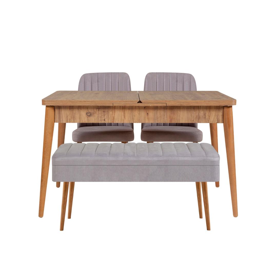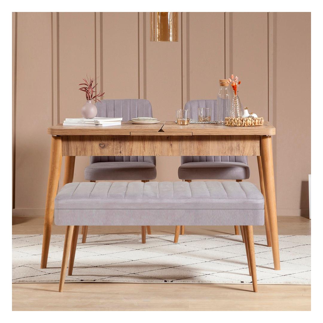 Komplekti kuulub kaks tooli ja üks pink, mis pakuvad mitmekülgseid istumisvõimalusi teie söögitoa jaoks. Toolid on disainitud mugava 45 cm kõrguse istmega, mis võimaldab teil ja teie külalistel istuda ja lõõgastuda söögi ajal. Pink pakub täiendavat istumisruumi ja seda saab paigutada vastu seina, kui seda ei kasutata.