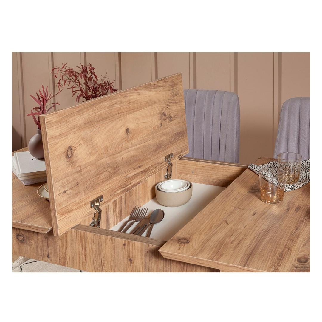 Selle elegantse ja moodsa disainiga söögikomplekt lisab igasse ruumi elegantsust. Atlandi männi ja halli värvi kombinatsioon loob kaasaegse välimuse, mis täiendab mis tahes sisekujundust. Olenemata sellest, kas korraldate õhtusöögipidu või naudite perekondlikku söögikorda, see komplekt avaldab külalistele kindlasti muljet.