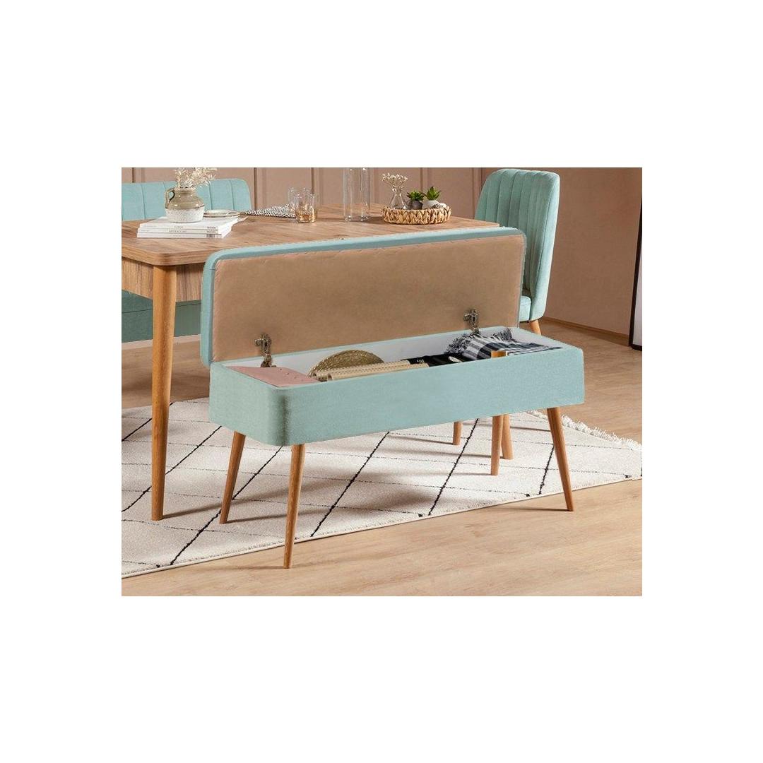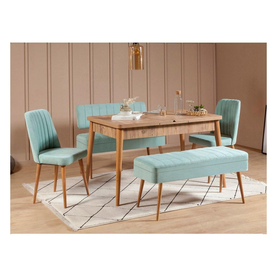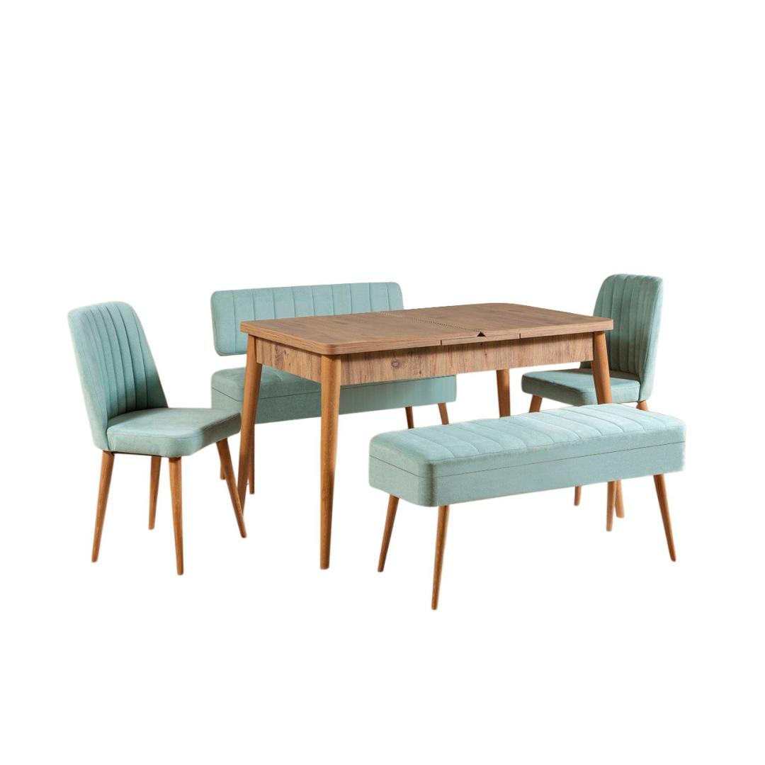 Pikendatav söögilaud kohandub vaevata vastavalt teie vajadustele, võimaldades teil mahutada rohkem külalisi ja luua sooja ja kutsuvat atmosfääri. Atlandi männi viimistlus lisab teie ruumile loodusliku ilu, samas kui pistaatsia rohelised toolid ja pink annavad värvi ja elujõudu.