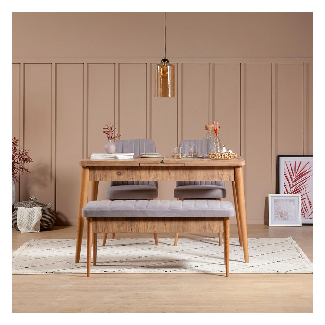 Söögilaud on uhke oma voolujoonelise disaini üle, mille laius on 130 cm, kõrgus 77 cm ja sügavus 80 cm. Täielikult avatud, ulatub see laiuseni 165 cm, muutes selle ideaalseks õhtusöökide või peresündmuste korraldamiseks. Toolid ja pink on kaetud luksusliku sametkangaga, pakkudes nii mugavust kui ka stiili.