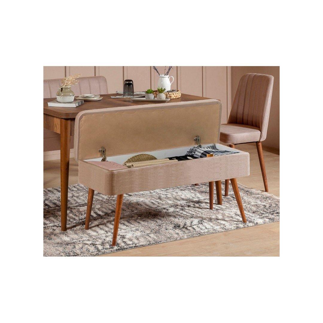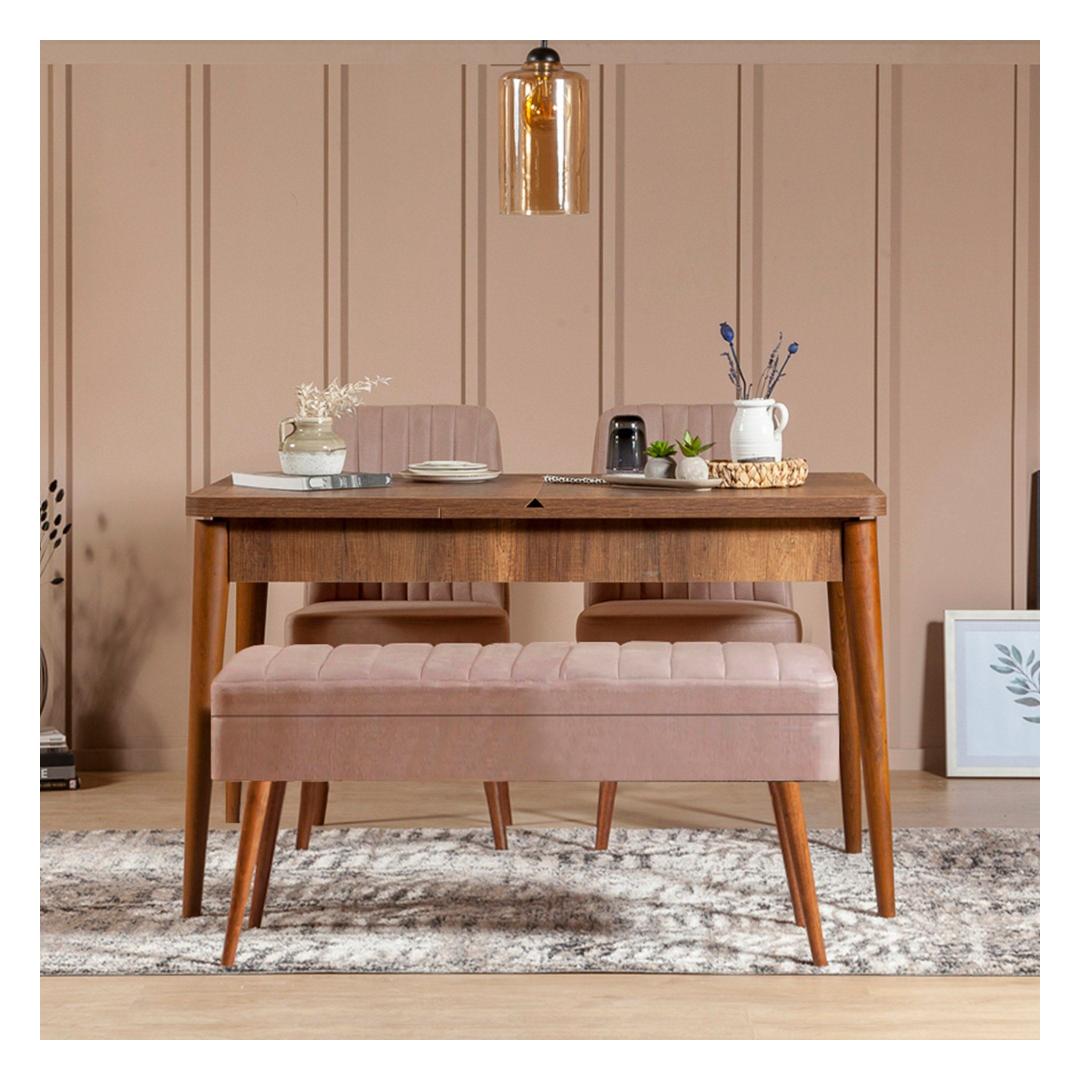 Selle elegantse ja moodsa disainiga söögikomplekt ühendab vaevata stiili ja funktsionaalsuse. Rikkalik pähkelpuu- ja kivivärv lisab elegantsi, muutes selle ideaalseks keskmeks igasse söögituppa. Väljatõmmatav laud võimaldab teil mahutada rohkem külalisi, tagades, et keegi ei jää nende eriliste koosviibimiste ajal kõrvale.
