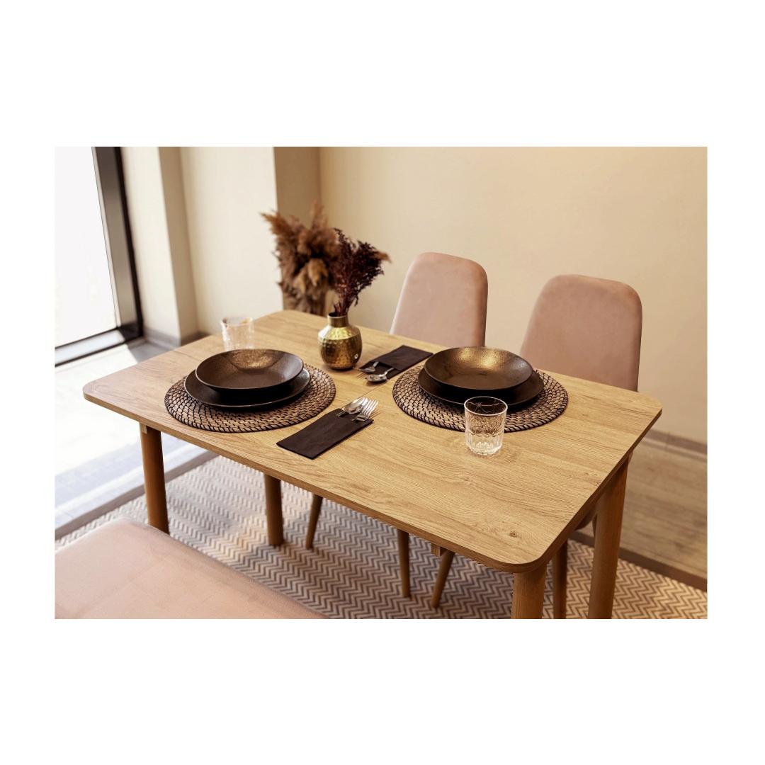 Söögilaua ja toolide komplekti voolujooneline disain lisab igasse söögituppa elegantsi. Tamme ja kivi värvid sulanduvad sujuvalt igasse interjööristiili, muutes selle teie kodu jaoks mitmekülgseks valikuks.