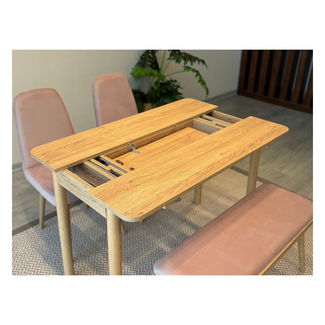 Muuda oma söögituba stiilseks ja funktsionaalseks alaks meie pikendatava söögilaua ja toolide komplektiga. Valmistatud 100% melamiinkattega puitlaastplaadist, on see komplekt mitte ainult vastupidav, vaid kiirgab ka modernset võlu, mis tõstab teie kodu sisustust.