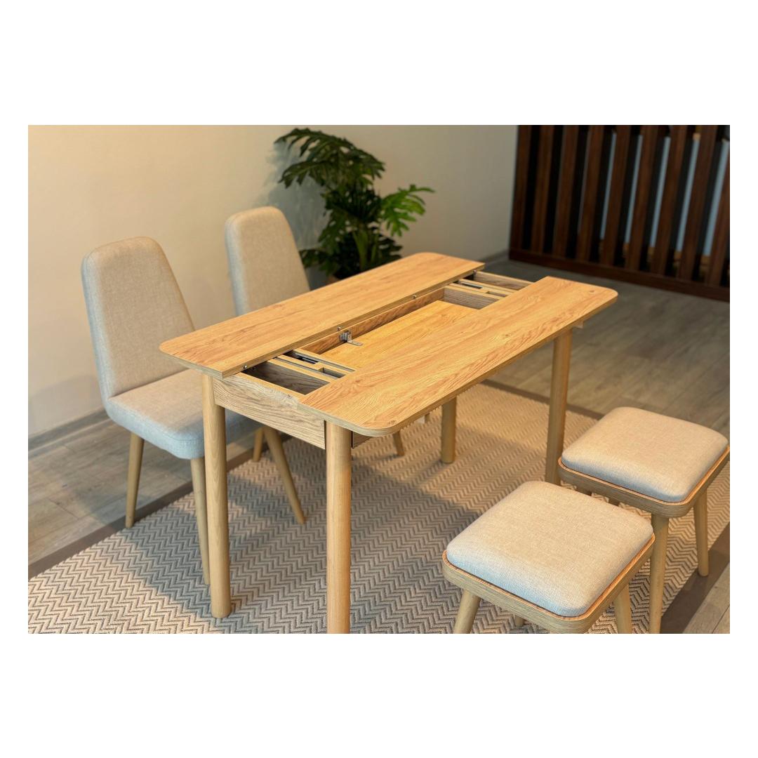 Tamme ja kreemika värvi kombinatsioon annab sellele komplektile ajatu ja elegantse ilme, mis sobib igasuguse sisustuse stiiliga. Pikendatav laud võimaldab sul vajadusel hõlpsasti rohkem külalisi mahutada, muutes selle ideaalseks õhtusöökide või peresündmuste korraldamiseks.