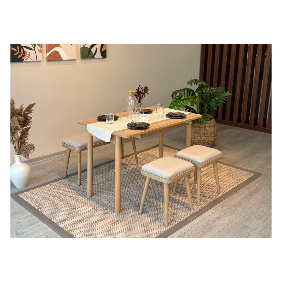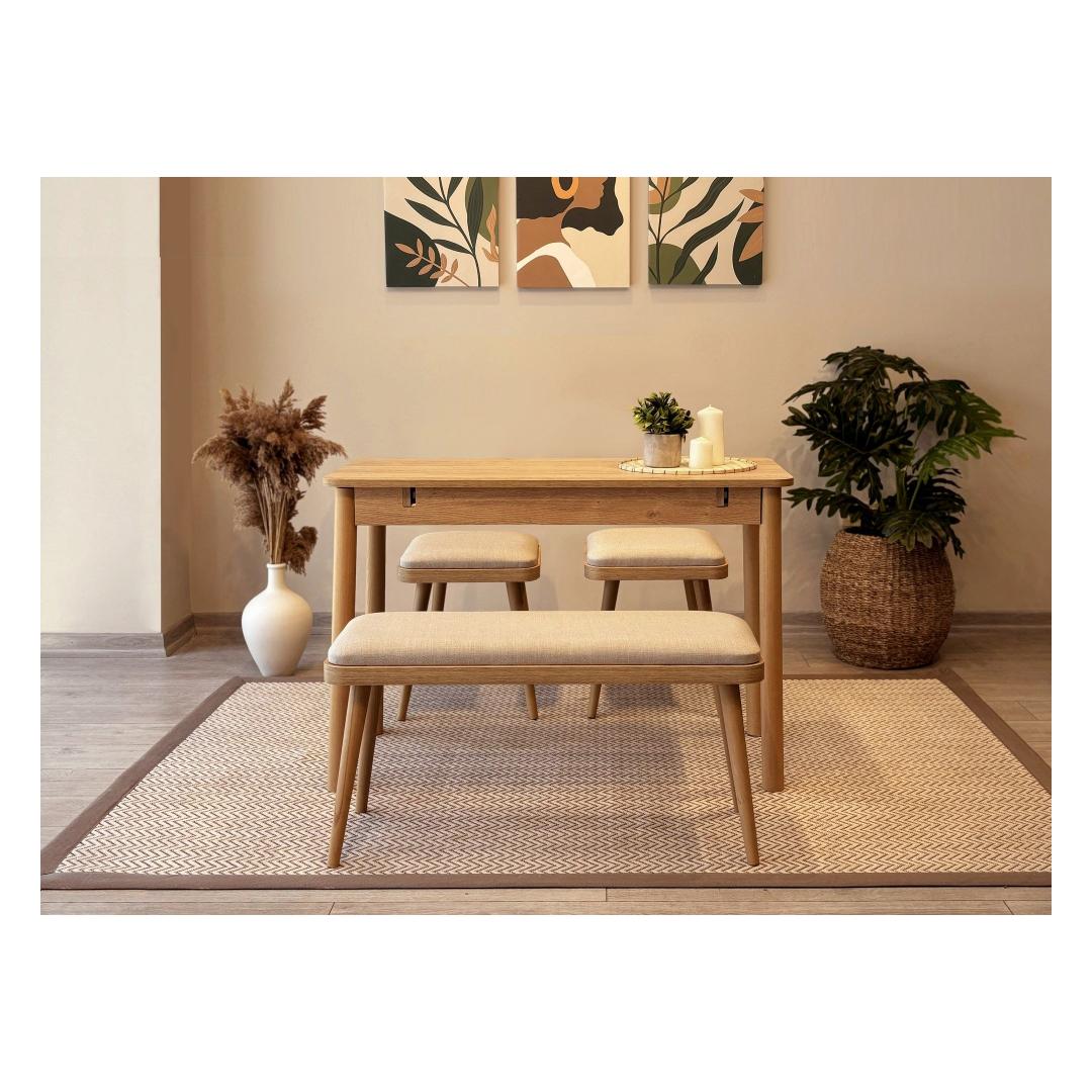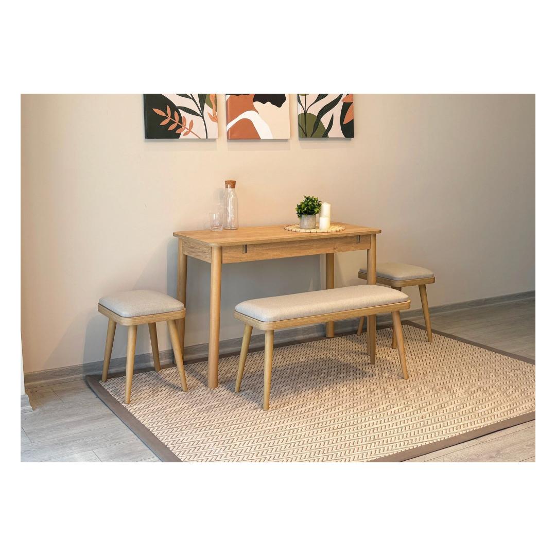 Mitmekülgne: Pikendatav söögilaud võimaldab teil vajadusel hõlpsasti lisakülastajaid mahutada, muutes selle ideaalseks peresündmusteks või õhtusöökideks. Komplekt sisaldab 2 taburetti ja 1 pinki, pakkudes piisavalt istekohti teie külalistele.