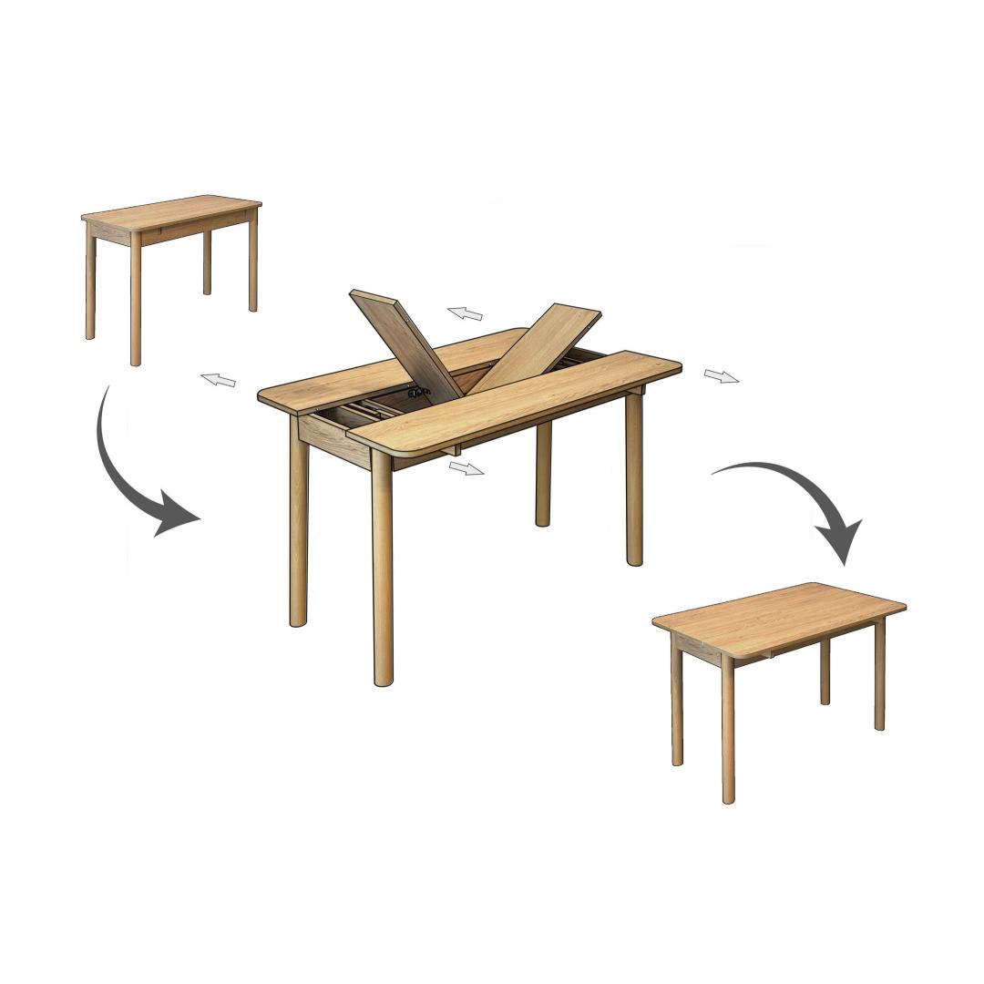 Söögilaud on 110 cm lai ja 75 cm kõrge, pakkudes piisavalt ruumi sinu toitude jaoks. Pikendatuna ulatub laua sügavus 70 cm-ni, mahutades rohkem külalisi koosolekute jaoks. Komplekt sisaldab nelja taburetti ja ühte pinki, mille kõrgus on mugav 46 cm, ideaalne pikkadeks vestlusteks õhtusöögi ajal.