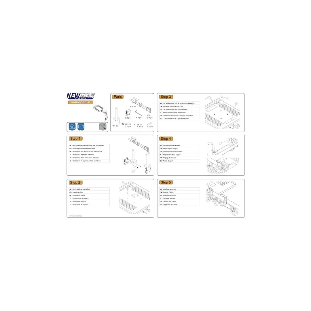 NewStar NOTEBOOK-D100 has two pivot points and is suitable for notebooks up to 22" (55 cm). The weight capacity of this product is 15 kg each notebook. The desk mount is suitable for most notebooks.
