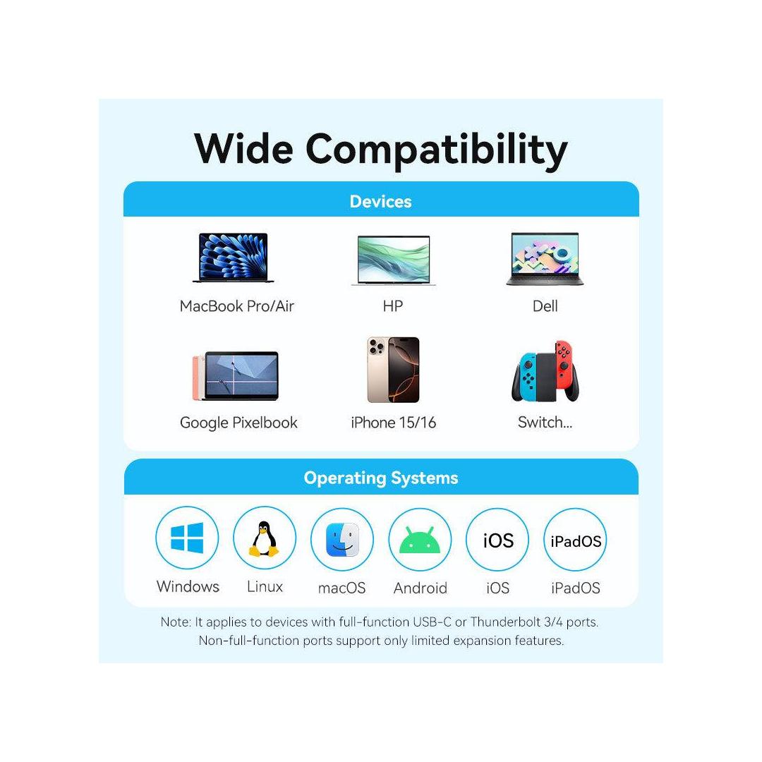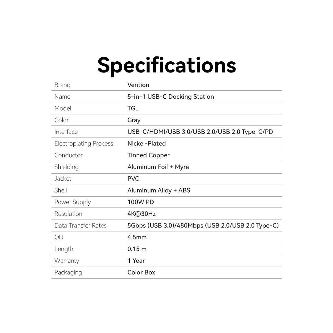 Vention USB-C to HDMI + USB 3.0 + USB 2.0 + USB 2.0 Type-C + PD Docking Station. Connectivity technology: Wired, Host interface: USB 3.2 Gen 1 (3.1 Gen 1) Type-C, USB Power Delivery up to: 100 W. Product colour: Grey, HD type: 4K Ultra HD, Hub interfaces: HDMI, USB 2.0, USB 3.0, USB Type-C. Power supply type: USB. Other operating systems supported: Android, iOS, iPadOS. Width: 28.4 mm, Depth: 110.3 mm, Height: 15 mm