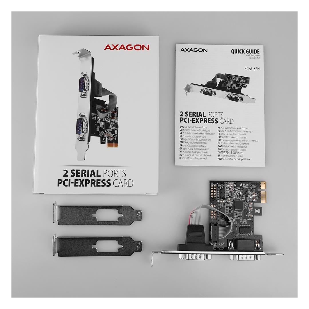 The AXAGON PCEA-S2N PCI-Express card extends your desktop PC by two RS-232 serial ports with DB-9 connectors.