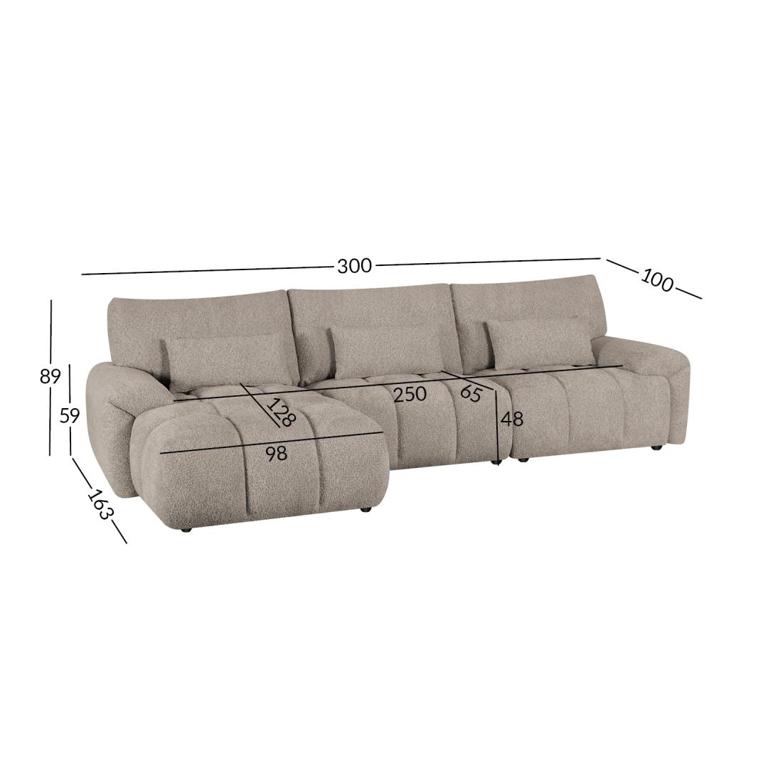 Diivani üldmõõdud: 300 x 100/163 x H89 cm.