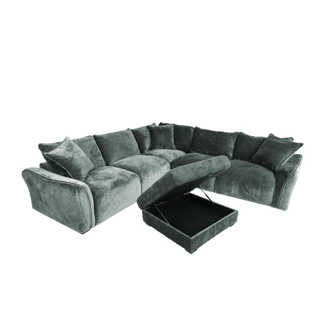 Luksusliku sametise kangaga kaetud pehme ja mahukas nurgadiivan on tõeline pilgupüüdja igas elutoas. Diivani juurde kuulub funktsionaalne panipaigaga tumba.