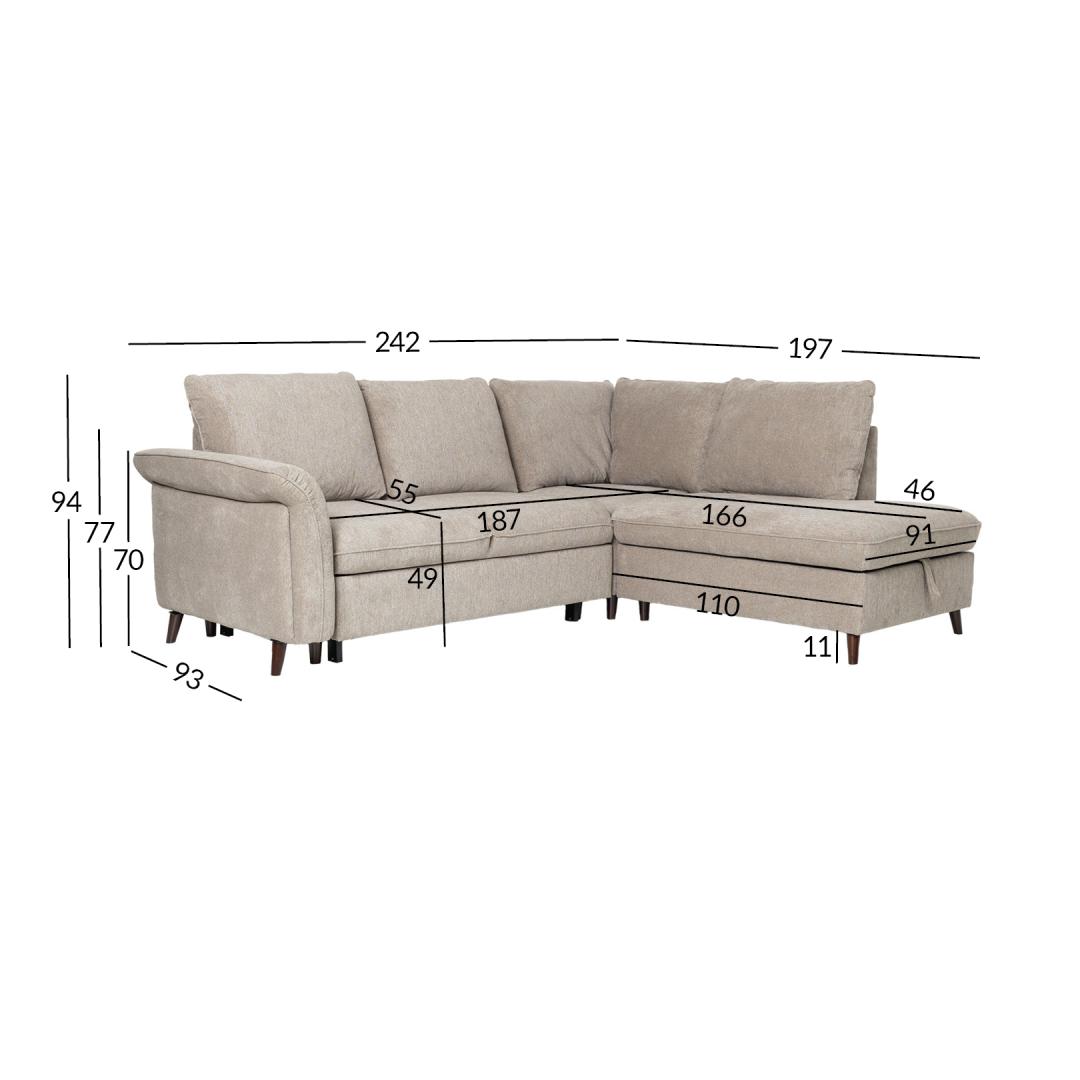 Diivani üldmõõdud: 242x93/197xH94cm. Istme laius 187cm, istme sügavus 55/166cm, istme kõrgus 49cm. Käetoe kõrgus maast 70cm. Diivani kõrgus raami ääreni 77cm.