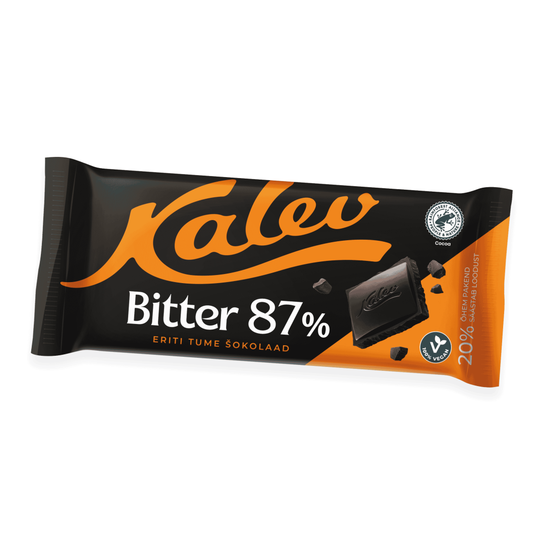 Kakaomass, vähendatud rasvasisaldusega kakaopulber, suhkur, kakaovõi, emulgaator (letsitiin), vanilliin. Kakao sisaldus vähemalt 87%. Võib sisaldada vähesel määral erinevaid pähkleid, maapähkleid, gluteeni sisaldavaid teravilju piima- ja munatooteid. Bitter 87% on kõige kõrgema kakaosisaldusega šokolaad Kalevi sortimendis. Toode kannab endas tumeda šokolaadi parimaid omadusi ja on meeltmööda eelkõige neile, kes eelistavad vähemagusat, intensiivset ja mõrkjat šokolaadi. Tumeda šokolaadi puhul on täheldatud, et see tekitab muuhulgas mõnusat heaolutunnet, tõstab tuju ja maandab stressi. Lisaks on sellel ka virgutav ja ergutav mõju. Tõelise energiapommina sobib hästi kõigile, kelle elu on seotud vaimse või füüsilise pingutusega.