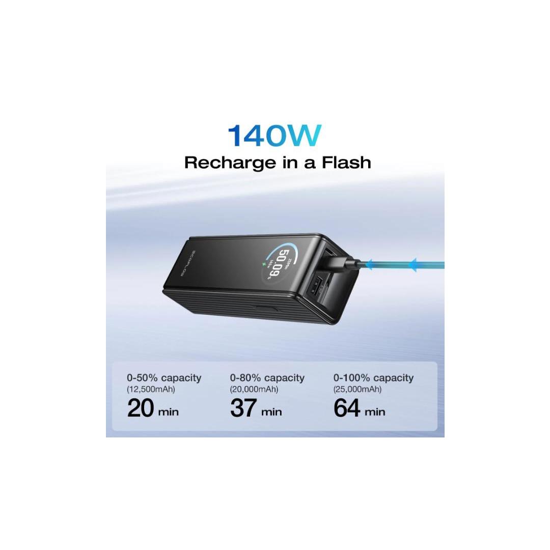 140W Max Input Power: The power bank can be recharged from 0% to 50% capacity in approx. 20 minutes.