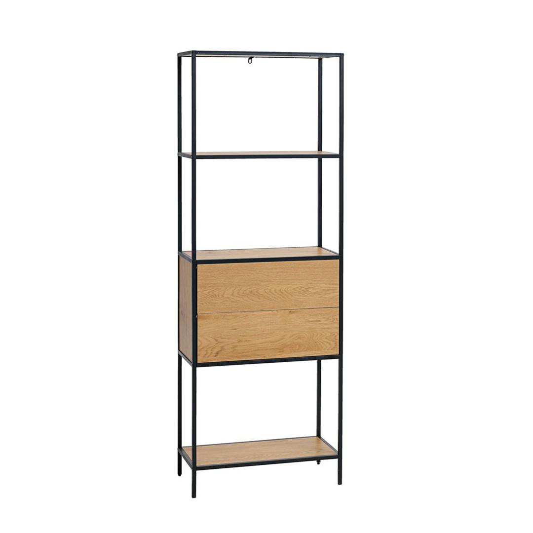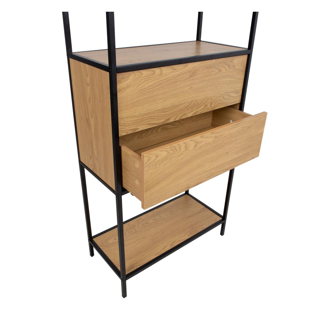 Riiul HEDVIG sahtliga 64x30xH178cm, saar/must. Riiulid ja sahtel: saare dekooriga melamiinplaat. Riiuli raam on valmistatud metallist ja viimistletud musta pulbervärviga. Riiul HEDVIG sahtliga 64x30xH178cm, saar/must. Riiulid ja sahtel: saare dekooriga melamiinplaat. Riiuli raam on valmistatud metallist ja viimistletud musta pulbervärviga.