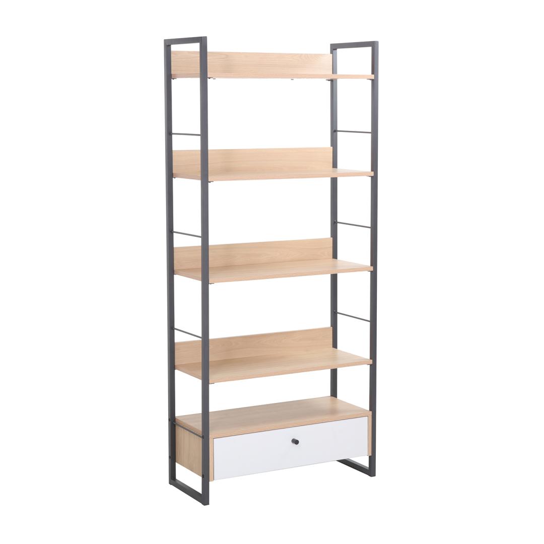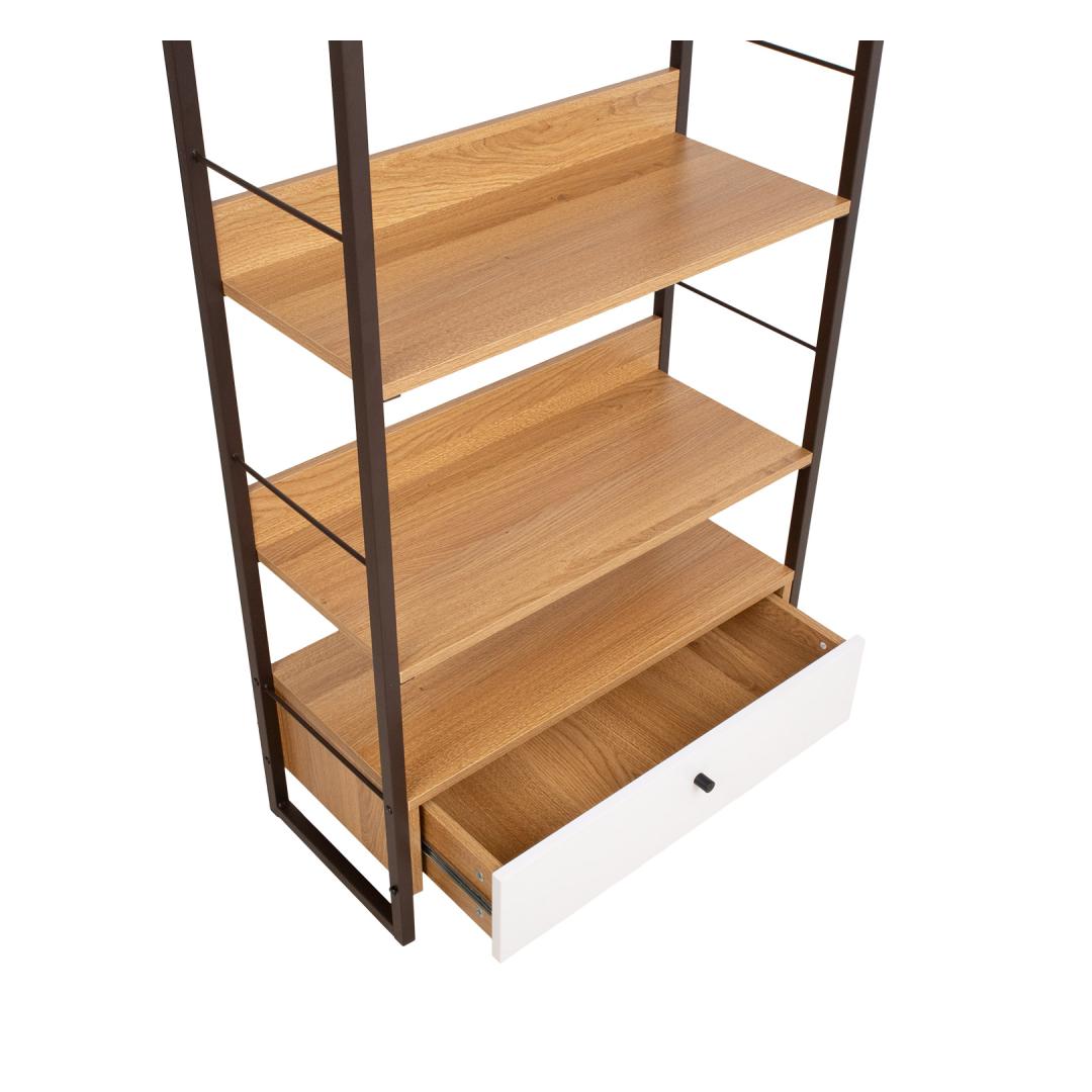 Riiul STUDY 70x30xH159cm, tamm/valge. Riiulid ja sahtli esipaneel: melamiinplaat. Riiuli raam on valmistatud metallist ja viimistletud pruuni pulbervärviga. Riiul STUDY 70x30xH159cm, tamm/valge. Riiulid ja sahtli esipaneel: melamiinplaat. Riiuli raam on valmistatud metallist ja viimistletud pruuni pulbervärviga.
