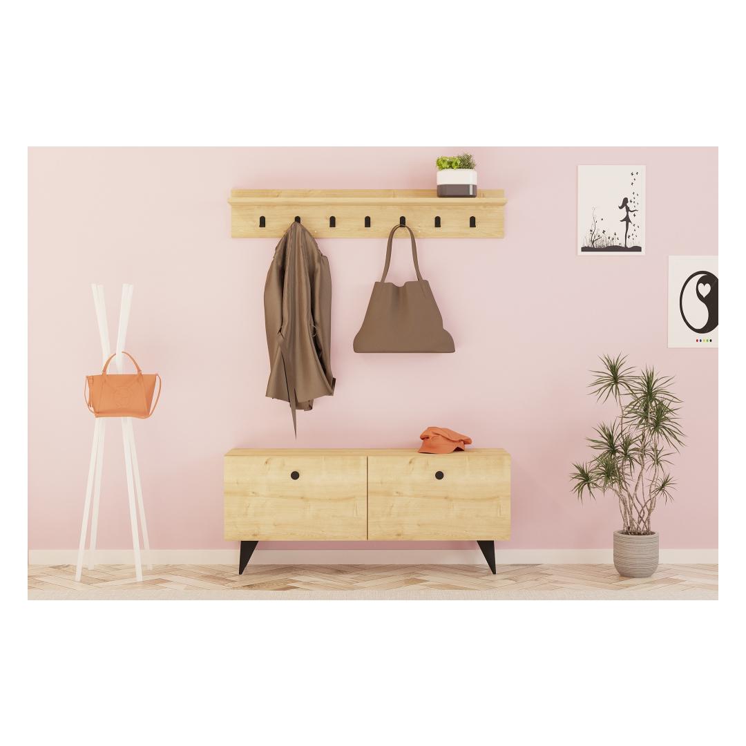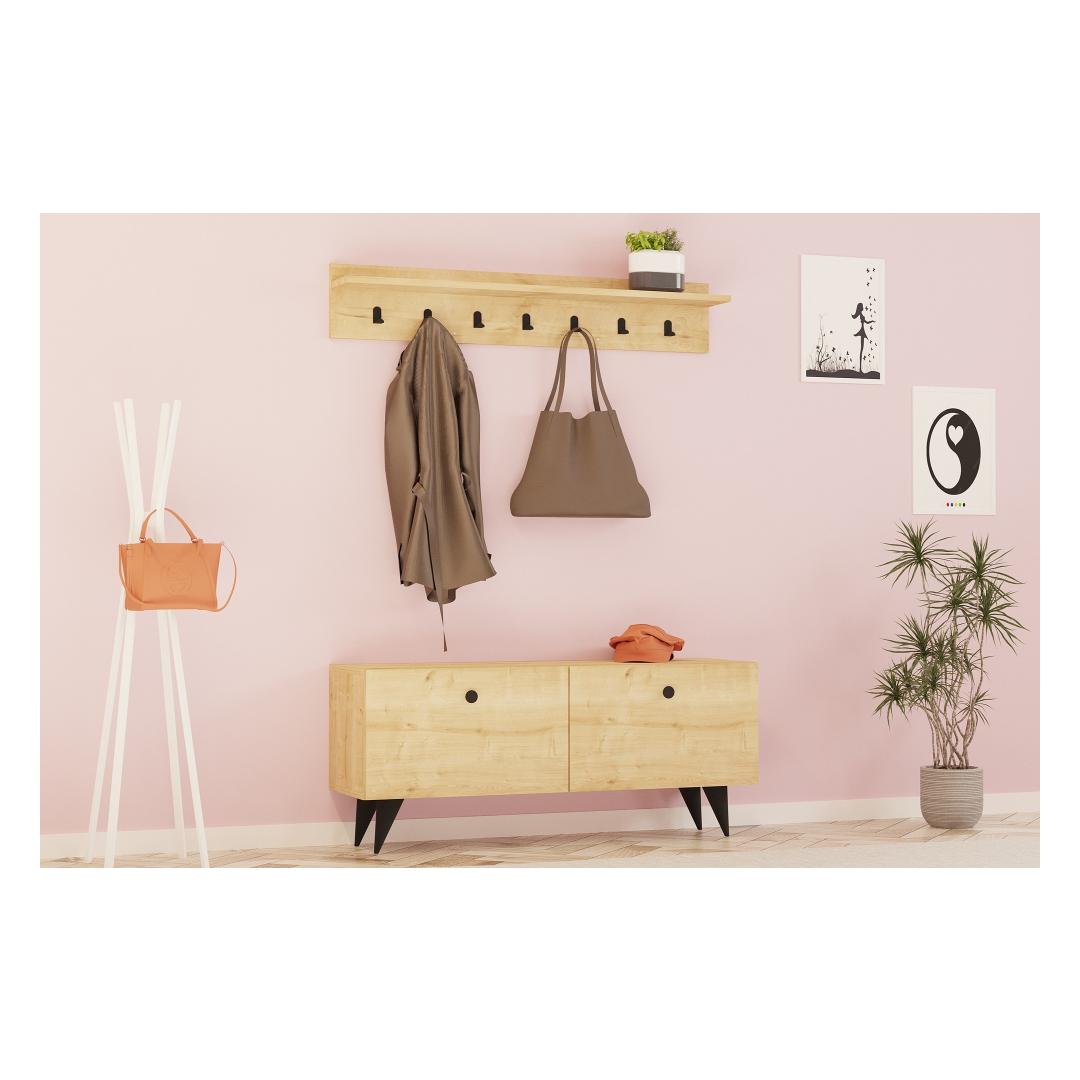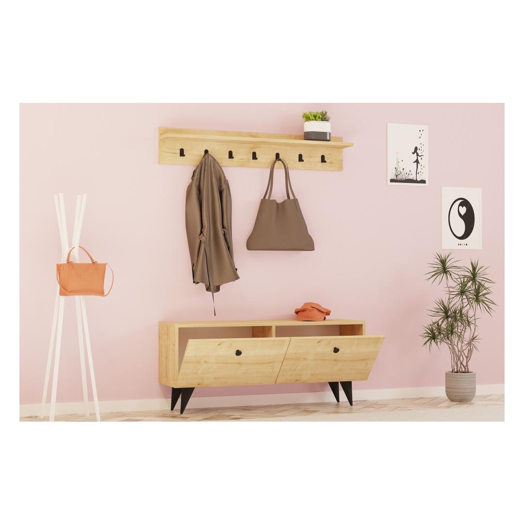 Tehke külalistele püsiv mulje, kui nad teie koju astuvad. Esikoha statiivi kütkestav disain, mis on inspireeritud hubastest majadest ja hüttidest, viib nad soojuse ja mugavuse maailma. Selle rikkalik tammevärv lisab elegantsi, muutes selle ideaalseks täienduseks igale interjööristiilile.