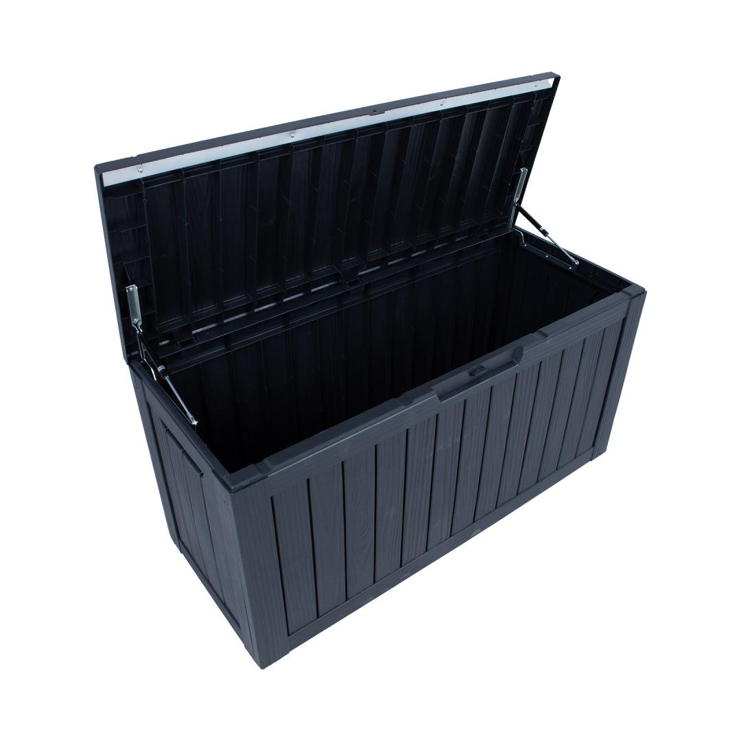 Tugev ja mahukas plastikkast on hea lahendus aiatarvete või suvemööbli patjade hoiustamiseks.