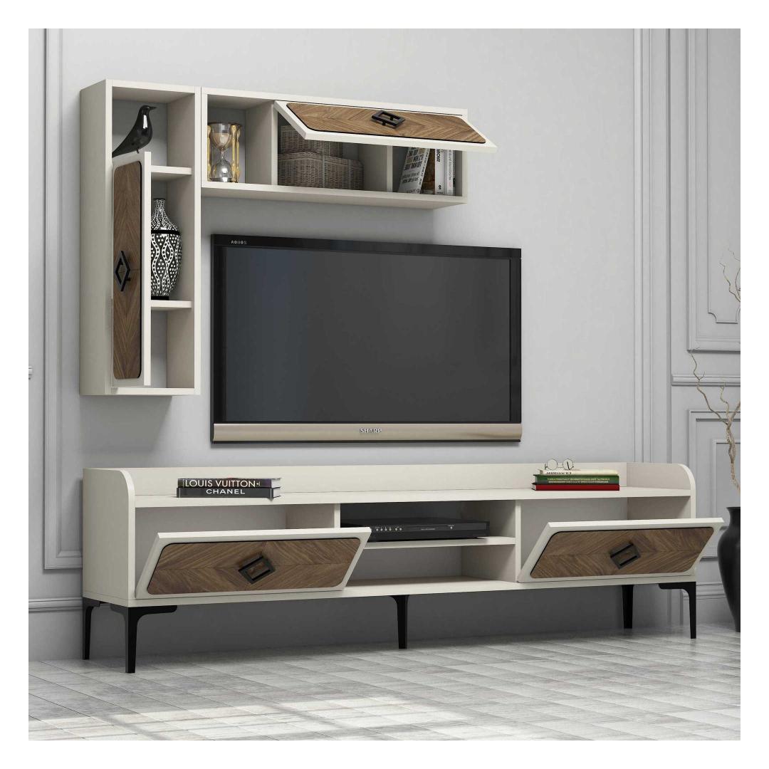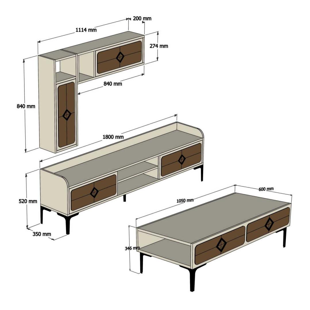 Selle elegantse ja moodsa disainiga mööblikomplekt ühendab vaevata funktsionaalsuse ja elegantsi. Rikkalik pähkelpuu- ja kreemikas värvus lisab elegantsi, muutes selle ideaalseks täienduseks igasse kaasaegsesse koju.