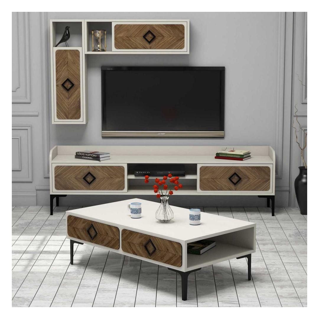 Teler, seinariiulid ja kohvilaud saab hõlpsasti seinale kinnitada, tagades stabiilsuse ja ohutuse. 18 mm paksune melamiiniga kaetud puitlaastplaat tagab vastupidavuse ja pikaealisuse, mistõttu on see komplekt mõistlik investeering aastateks.