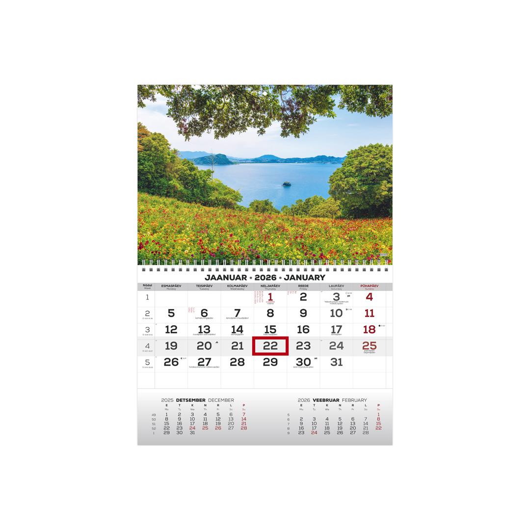 Mõõt: 297 x 420 mm Spiraalköide Riputusauk Sisu maht 12 lehte Kuupäevamärkija Sisu tumehall / punane Keel: eesti ja inglise Kalendaarium sisaldab järgmist: Riigipühad, riiklikud ja rahvakalendri tähtpäevad, lipupäevad, 37 riigi riigipühad lühenditega, suve- ja talveajale üleminek, päikese tõusu ja loojangu kellaajad (Tallinn), kuu faasid kellaaegadega, sodiaagimärgid, aastaaegade algused kellaaegadega, eelnev ja järgnev kuu, nädala number.
