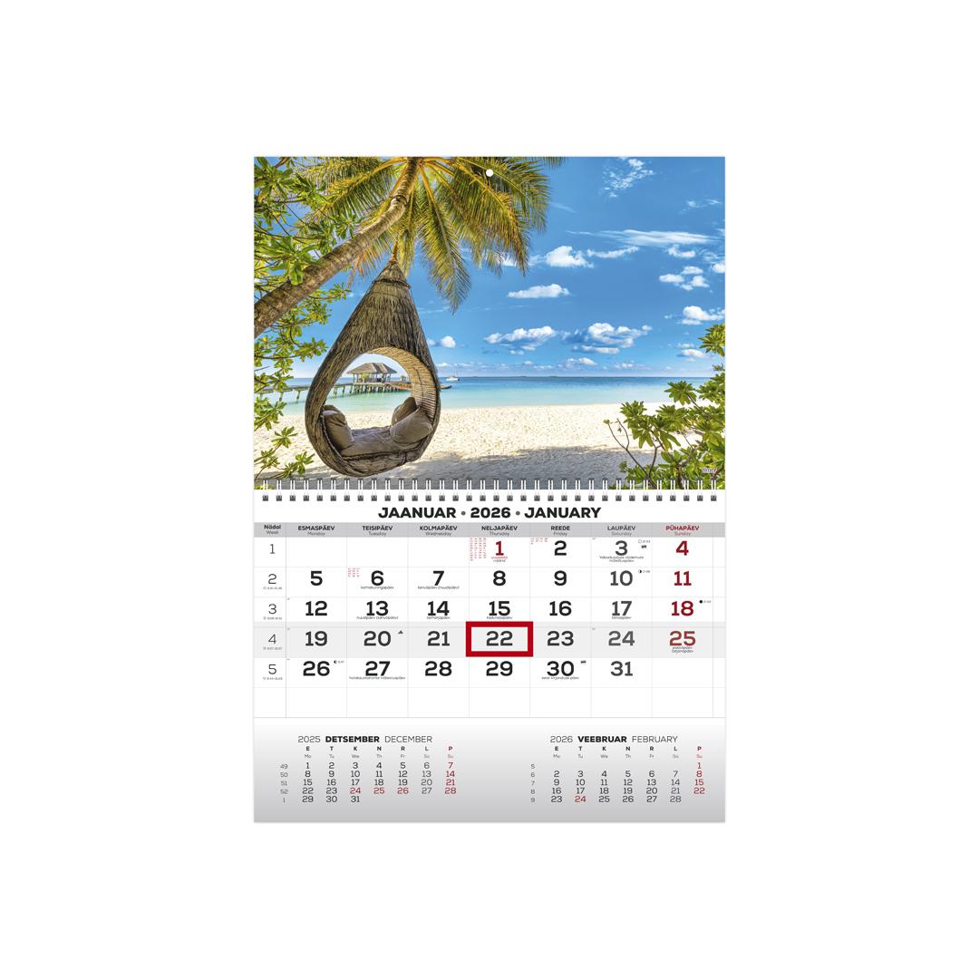Mõõt: 297 x 420 mm Spiraalköide Riputusauk Sisu maht 12 lehte Kuupäevamärkija Sisu tumehall / punane Keel: eesti ja inglise Kalendaarium sisaldab järgmist: Riigipühad, riiklikud ja rahvakalendri tähtpäevad, lipupäevad, 37 riigi riigipühad lühenditega, suve- ja talveajale üleminek, päikese tõusu ja loojangu kellaajad (Tallinn), kuu faasid kellaaegadega, sodiaagimärgid, aastaaegade algused kellaaegadega, eelnev ja järgnev kuu, nädala number.