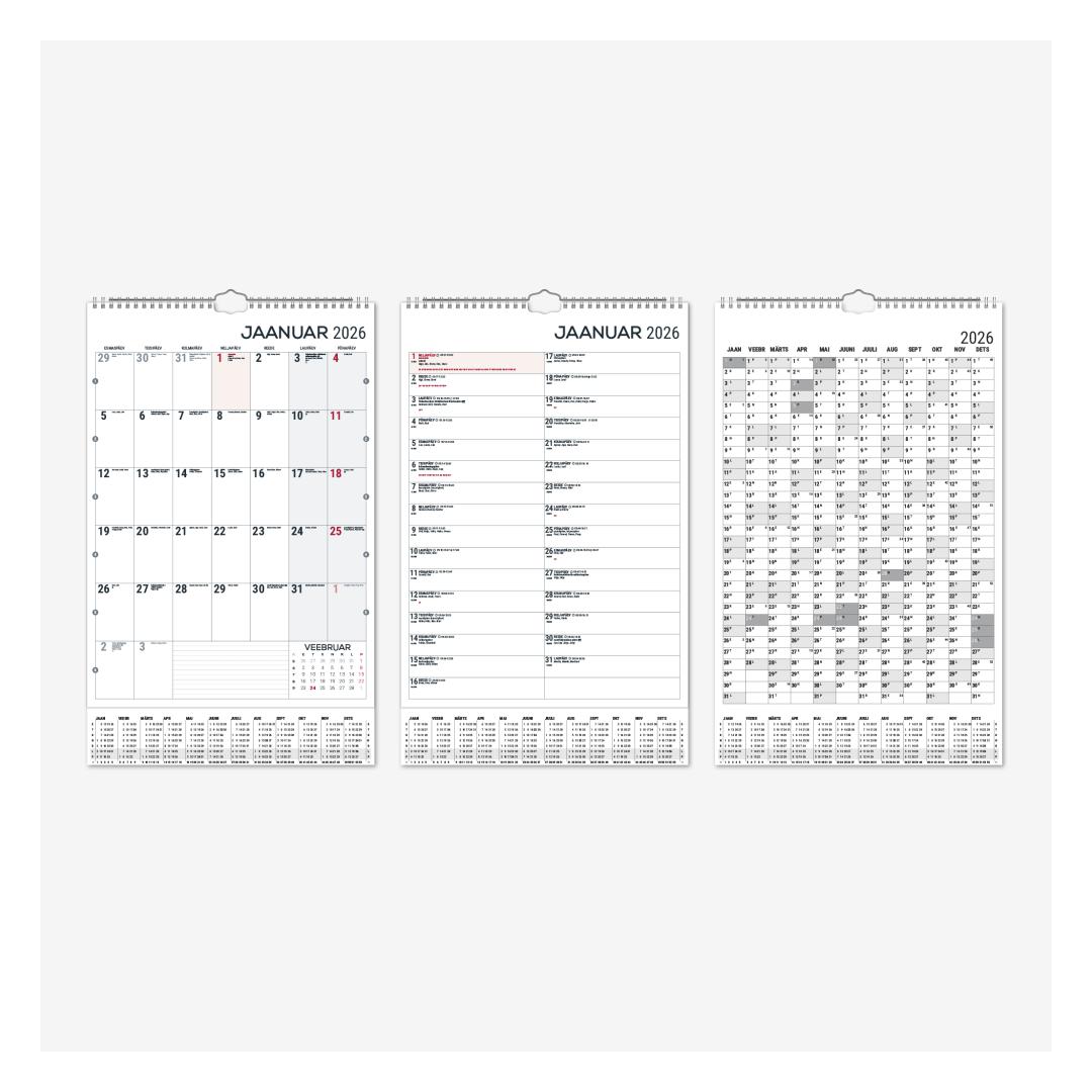 Mõõt: 297 x 420 mm Spiraalköide Riputusauk Sisu maht 12 lehte Kuupäevamärkija Sisu tumehall / punane Keel: eesti ja inglise Kalendaarium sisaldab järgmist: Riigipühad, riiklikud ja rahvakalendri tähtpäevad, lipupäevad, 37 riigi riigipühad lühenditega, suve- ja talveajale üleminek, päikese tõusu ja loojangu kellaajad (Tallinn), kuu faasid kellaaegadega, sodiaagimärgid, aastaaegade algused kellaaegadega, eelnev ja järgnev kuu, nädala number.
