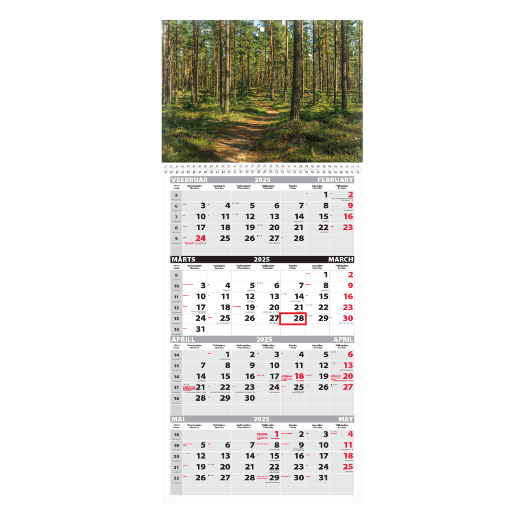 Nelja kuu vaatega seinakalender. Avatud mõõt koos pildiga 297x760mm. Punane staatiline kuupäevamärkija. Kalendaarium sisaldab riigipühi, riiklikke ja rahvakalendri tähtpäevi, lipupäevi, 42 riigi pühi lühenditena, päikese tõusu ja loojangu aegu, kuu faase, aastaaegade alguseid. Päeva ja kuu nimed eesti ja inglise keeles. Tellides oma pildi ja/või reklaamribaga hind muutub.