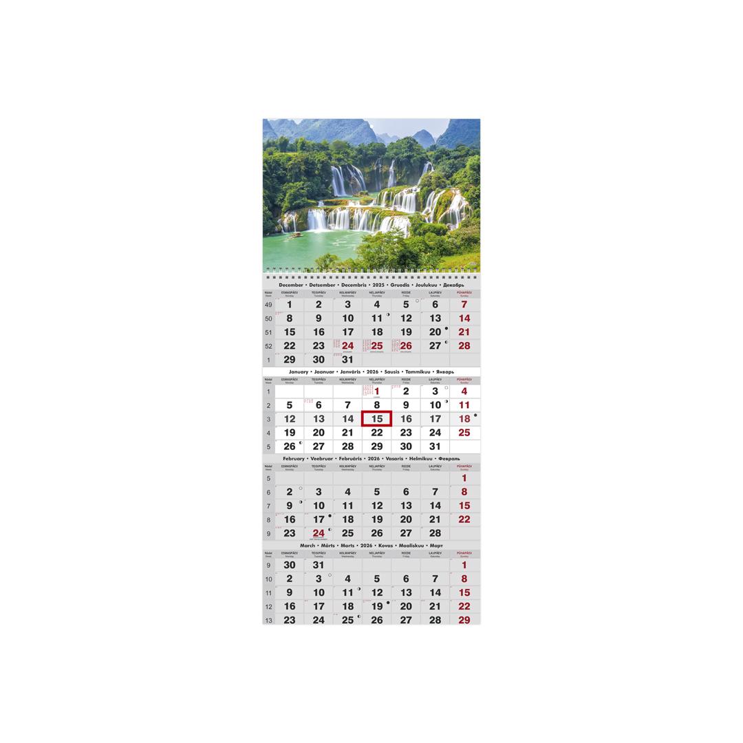 Mõõt: 297 x 690 mm Spiraalköide Riputusauk Sisu maht 12 lehte Kuupäevamärkija Sisu tumehall / punane Keel: eesti, inglise, läti, leedu, soome, vene Kalendaarium sisaldab järgmist: Riigipühad, 37 riigi riigipühad lühenditega, kuu faasid, nädala number, eelnev ja 2 järgnevat kuud.