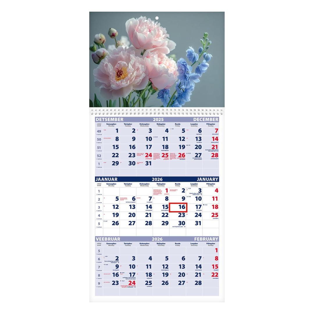 Kolme kuu vaatega seinakalender. Avatud mõõt koos pildiga 297x630mm. Punane staatiline kuupäevamärkija. Kalendaarium sisaldab riigipühi, riiklikke ja rahvakalendri tähtpäevi, lipupäevi, 42 riigi pühi lühenditena, päikese tõusu ja loojangu aegu, kuu faase, aastaaegade alguseid. Päeva ja kuu nimed eesti ja inglise keeles. Lehe parempoolsel küljel päevalahtrid sünnipäevade või sündmuste märkimiseks. Tellides oma pildi ja/või reklaamribaga hind muutub.