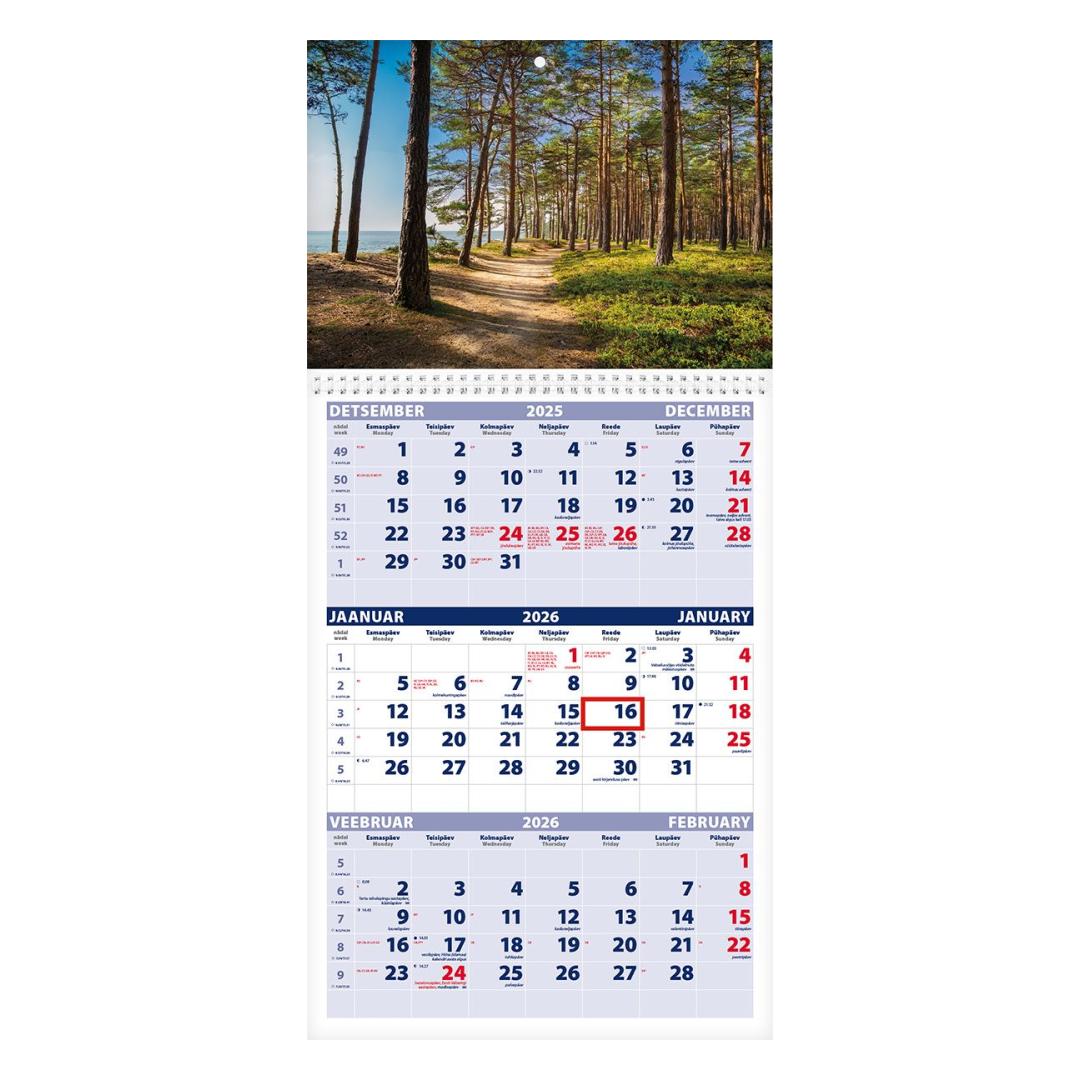 Kolme kuu vaatega seinakalender. Avatud mõõt koos pildiga 297x630mm. Punane staatiline kuupäevamärkija. Kalendaarium sisaldab riigipühi, riiklikke ja rahvakalendri tähtpäevi, lipupäevi, 42 riigi pühi lühenditena, päikese tõusu ja loojangu aegu, kuu faase, aastaaegade alguseid. Päeva ja kuu nimed eesti ja inglise keeles. Lehe parempoolsel küljel päevalahtrid sünnipäevade või sündmuste märkimiseks. Tellides oma pildi ja/või reklaamribaga hind muutub.