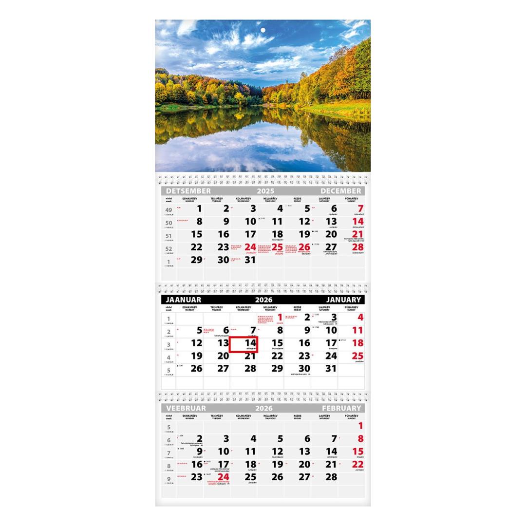Kolme kuu vaate ja kolme spiraaliga seinakalender. Avatud mõõt koos pildiga 297x640mm. Punane staatiline kuupäevamärkija. Kalendaarium sisaldab riigipühi, riiklikke ja rahvakalendri tähtpäevi, lipupäevi, 42 riigi pühi lühenditena, päikese tõusu ja loojangu aegu, kuu faase, aastaaegade alguseid. Päeva ja kuu nimed eesti ja inglise keeles. Tellides oma pildi ja/või reklaamribaga hind muutub.
