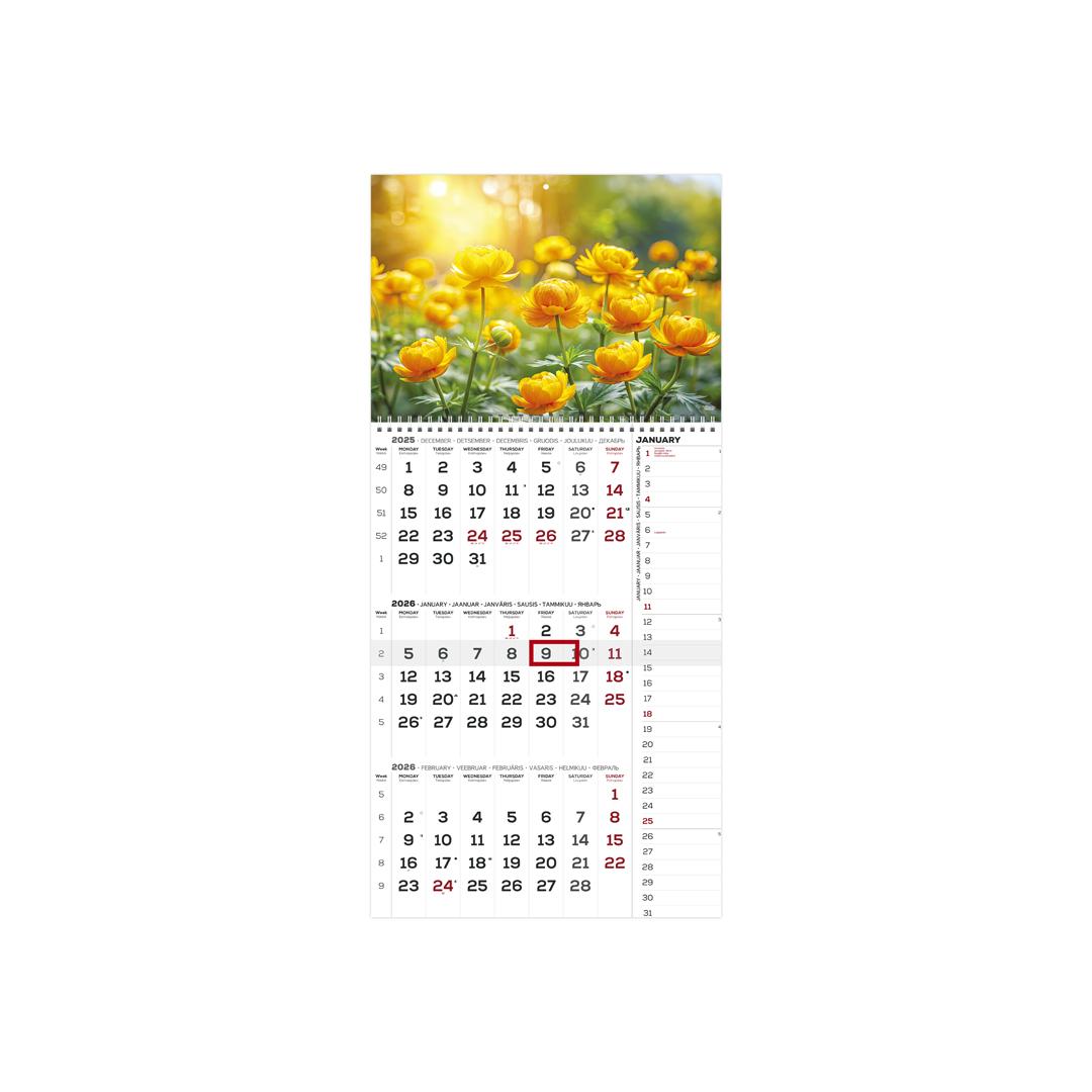 Mõõt: 297 x 630 mm Spiraalköide Riputusauk Sisu maht 12 lehte Kuupäevamärkija Sisu tumehall / punane Keel: eesti, inglise, läti, leedu, soome, vene Kalendaarium sisaldab järgmist: Riigipühad, 4 riigi riigipühad lühenditega (EST, LAT, LIT, FIN), kuu faasid, sodiaagimärgid, eelnev ja järgnev kuu, nädala number.