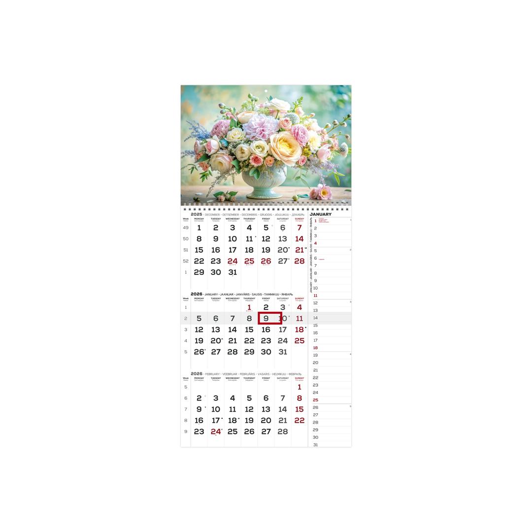 Mõõt: 297 x 630 mm Spiraalköide Riputusauk Sisu maht 12 lehte Kuupäevamärkija Sisu tumehall / punane Keel: eesti, inglise, läti, leedu, soome, vene Kalendaarium sisaldab järgmist: Riigipühad, 4 riigi riigipühad lühenditega (EST, LAT, LIT, FIN), kuu faasid, sodiaagimärgid, eelnev ja järgnev kuu, nädala number.
