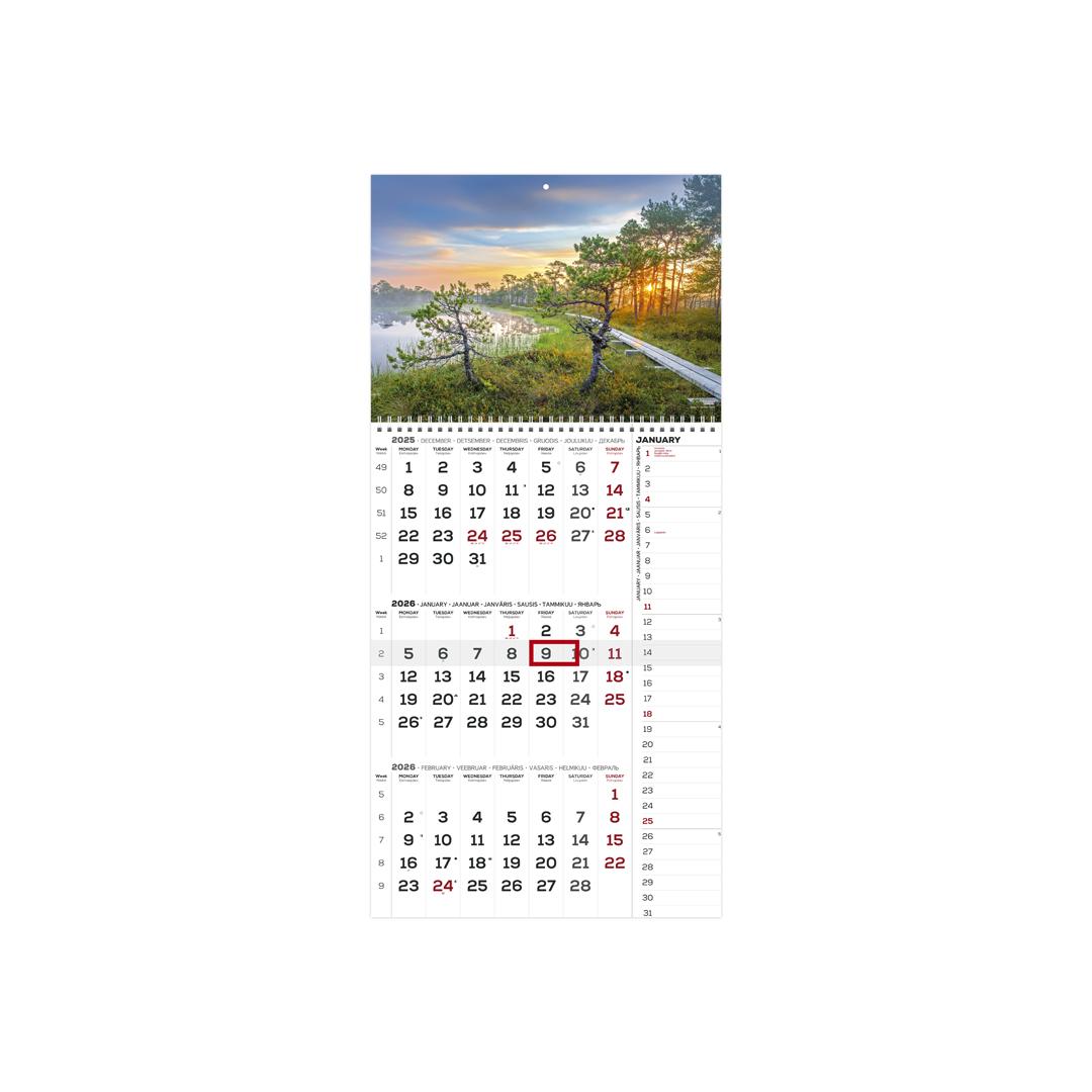 Mõõt: 297 x 630 mm Spiraalköide Riputusauk Sisu maht 12 lehte Kuupäevamärkija Sisu tumehall / punane Keel: eesti, inglise, läti, leedu, soome, vene Kalendaarium sisaldab järgmist: Riigipühad, 4 riigi riigipühad lühenditega (EST, LAT, LIT, FIN), kuu faasid, sodiaagimärgid, eelnev ja järgnev kuu, nädala number.