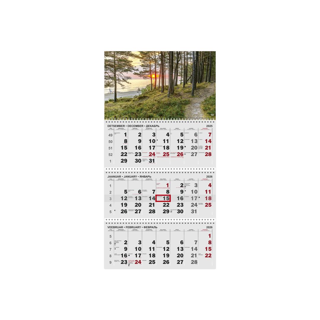 Mõõt: 340 x 650 mm Kolmeosaline spiraalköide Metallist kinnitusrims riputusaasaga Sisu maht 3 x 12 lehte Kuupäevamärkija Sisu tumehall / punane Keel: eesti, inglise, vene Kalendaarium sisaldab järgmist: 37 riigi riigipühad, riiklikud ja rahvakalendri tähtpäevad, lipupäevad, lühendatud tööpäevad, kaduneljapäevad, kuu faasid, sodiaagimärgid, aastaaegade algused kellaaegadega, eelnev ja järgnev kuu, nädala number.