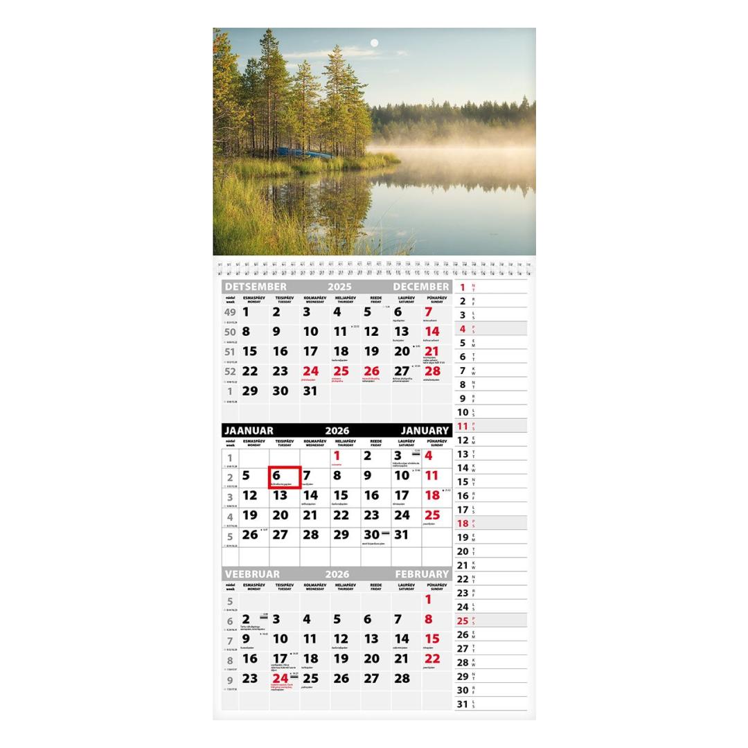 Kolme kuu vaatega seinakalender. Avatud mõõt koos pildiga 297x630mm. Punane staatiline kuupäevamärkija. Kalendaarium sisaldab riigipühi, riiklikke ja rahvakalendri tähtpäevi, lipupäevi, 42 riigi pühi lühenditena, päikese tõusu ja loojangu aegu, kuu faase, aastaaegade alguseid. Päeva ja kuu nimed eesti ja inglise keeles. Lehe parempoolsel küljel päevalahtrid sünnipäevade või sündmuste märkimiseks. Tellides oma pildi ja/või reklaamribaga hind muutub.