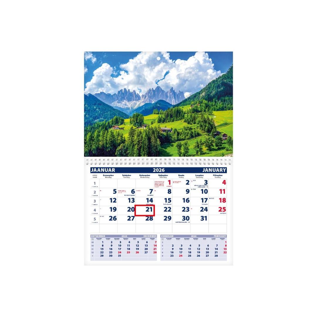 Kuuvaatega seinakalender. Avatud mõõt koos pildiga 297x425mm. Punane staatiline kuupäevamärkija. Kalendaarium sisaldab riigipühi, riiklikke ja rahvakalendri tähtpäevi, lipupäevi, 42 riigi pühi lühenditena, päikese tõusu ja loojangu aegu, kuu faase, aastaaegade alguseid. Eelmine ja järgnev kuu alati avatud. Päeva ja kuu nimed eesti ja inglise keeles. Tellides oma pildi ja/või reklaamribaga hind muutub.