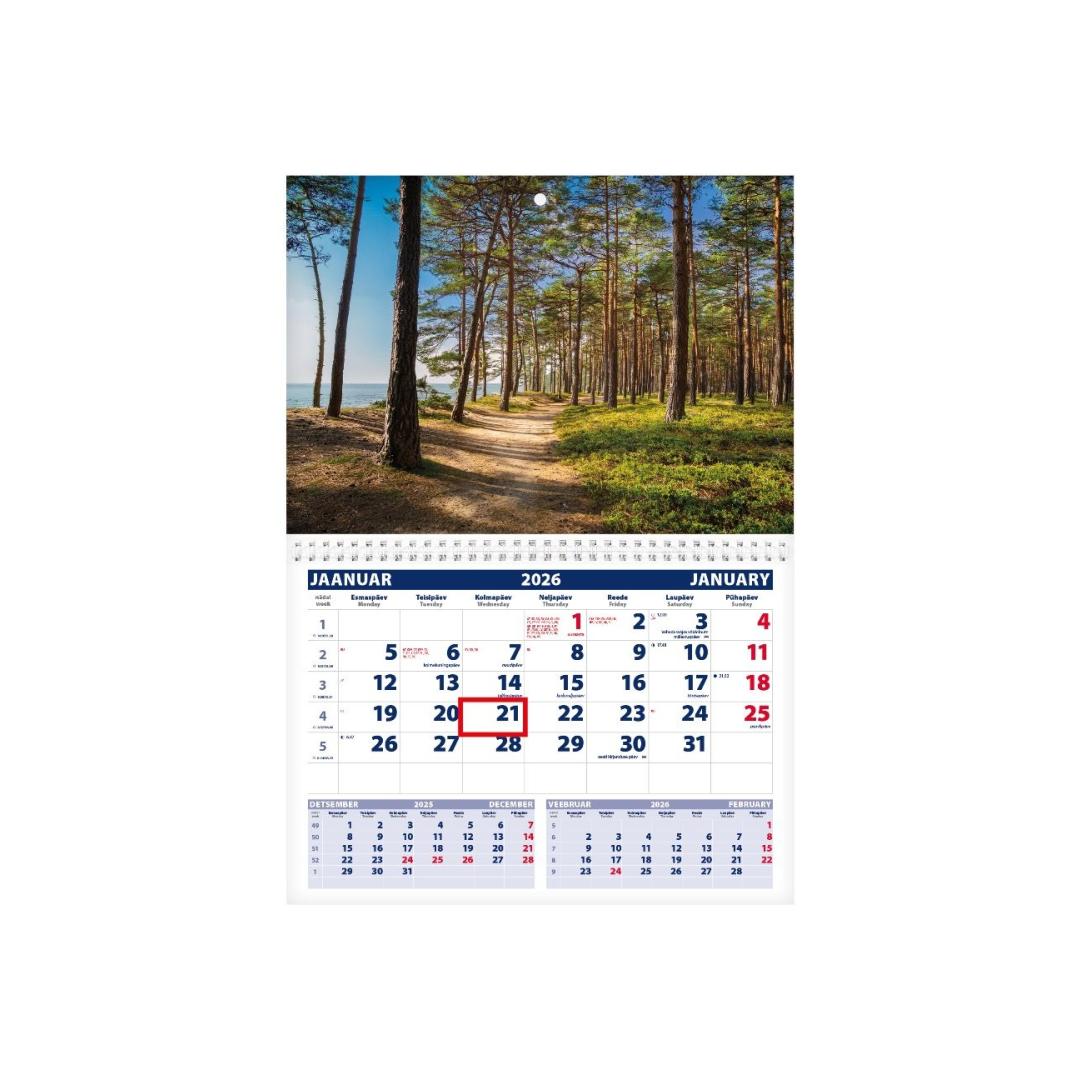 Kuuvaatega seinakalender. Avatud mõõt koos pildiga 297x425mm. Punane staatiline kuupäevamärkija. Kalendaarium sisaldab riigipühi, riiklikke ja rahvakalendri tähtpäevi, lipupäevi, 42 riigi pühi lühenditena, päikese tõusu ja loojangu aegu, kuu faase, aastaaegade alguseid. Eelmine ja järgnev kuu alati avatud. Päeva ja kuu nimed eesti ja inglise keeles. Tellides oma pildi ja/või reklaamribaga hind muutub.