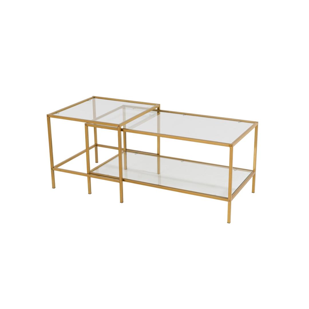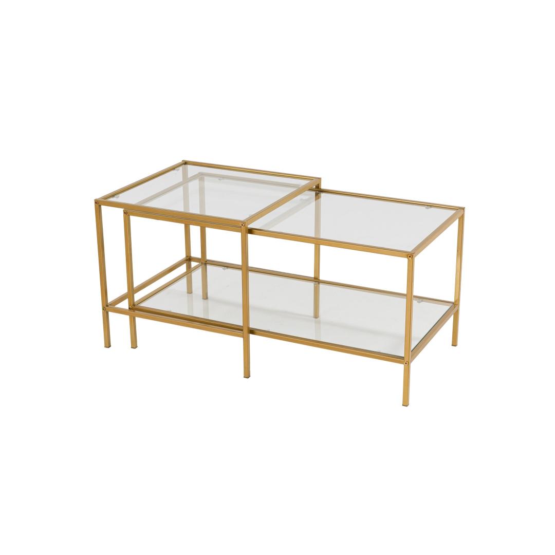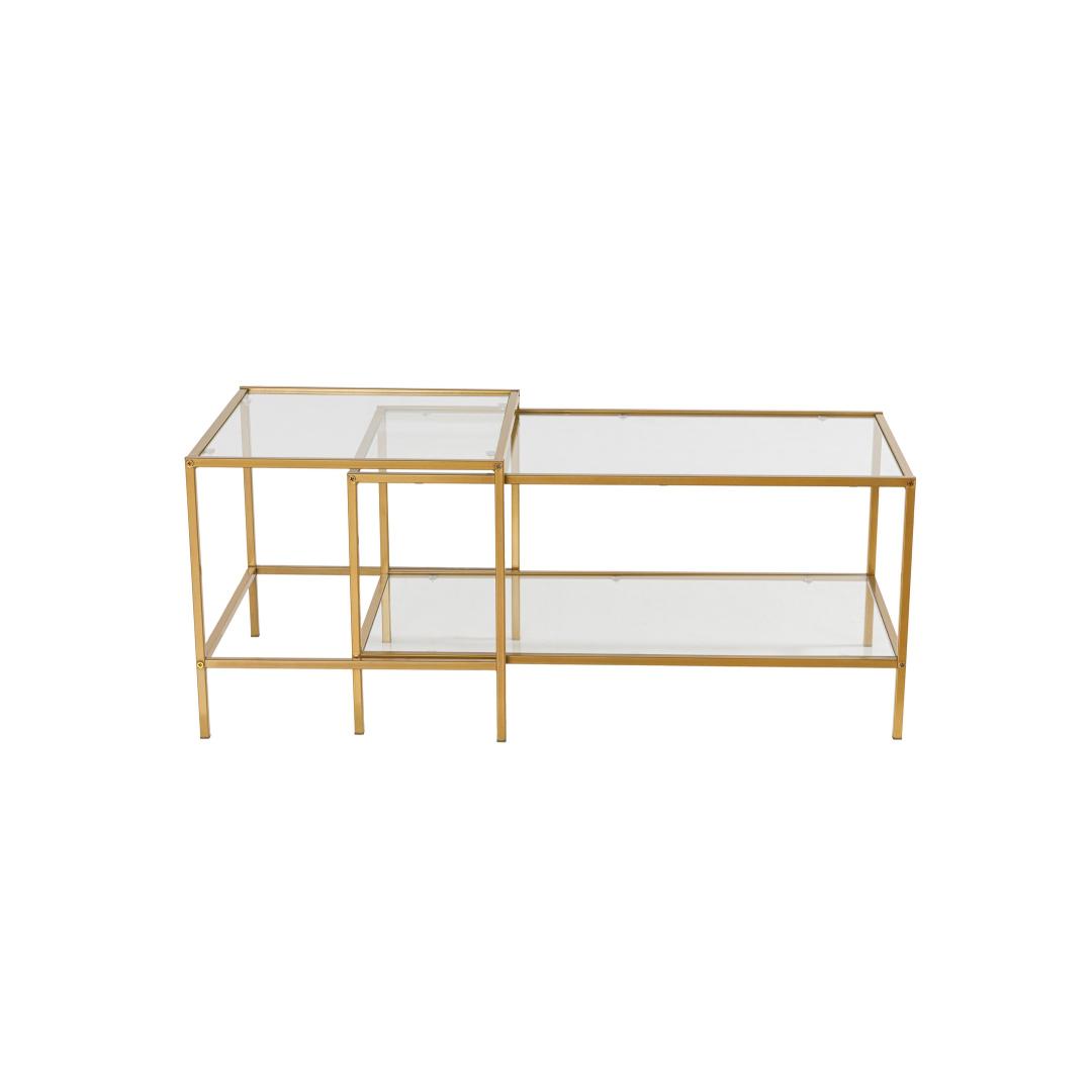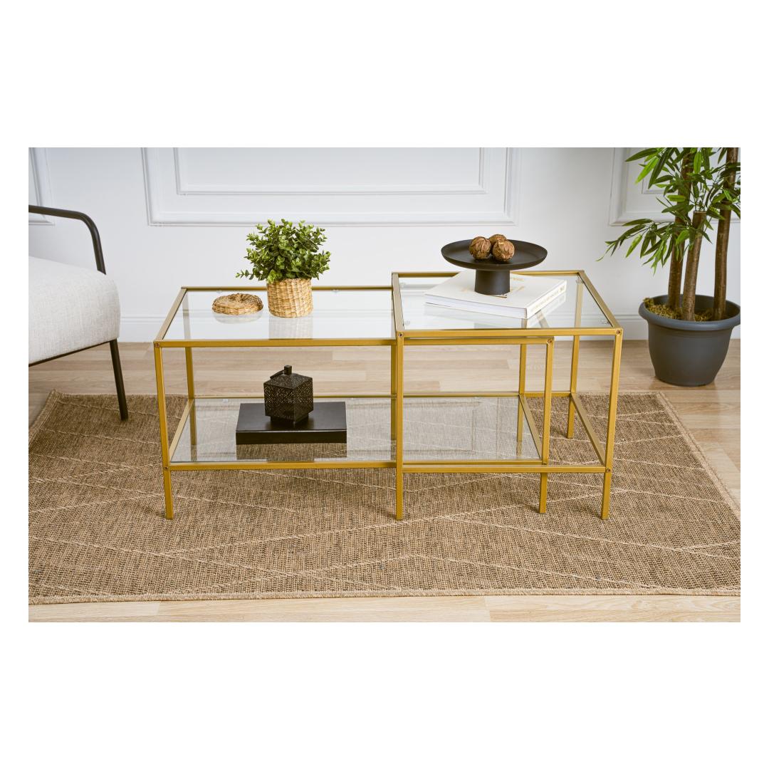 Muuda oma eluruum luksuslikuks oaasiks meie kauni kohvilaudade komplektiga. Valmistatud 100% karastatud klaasist ja tugeva metallraami abil, kiirgab see komplekt elegantsi ja rafineeritust. Sujuv disain ja kuldsed aktsendid tõstavad koheselt iga ruumi stiili, muutes selle ideaalseks keskpunktiks sinu kodus.