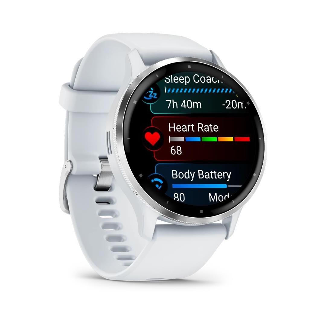 Venu 3|Screen 1.4"|Display technology AMOLED|Resolution 454 x 454|Wireless connections WLAN/Bluetooth|Memory 8 GB|GPS|Colour White / Silver|Weight 0.046 kg