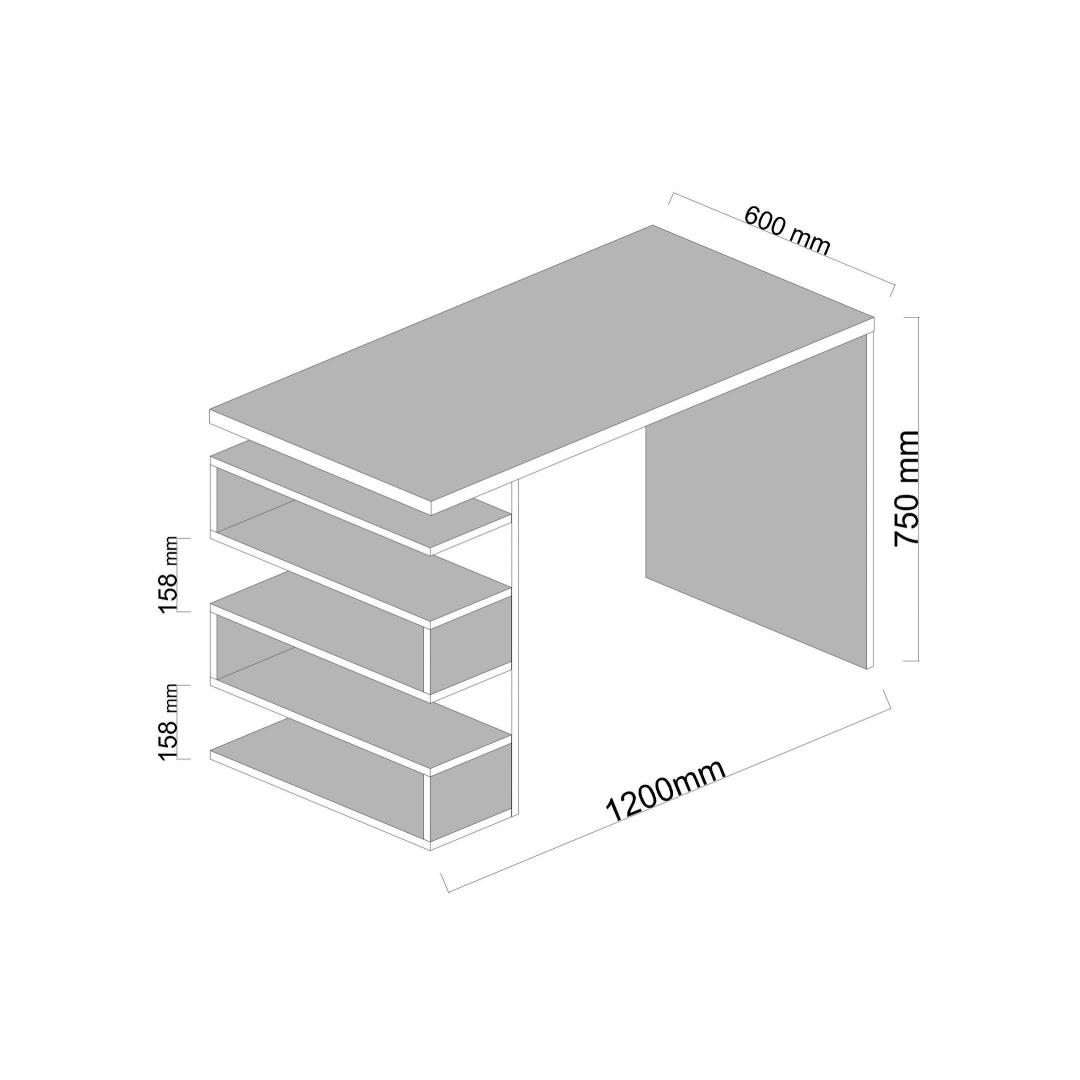 Meie töölaud pakub 120 cm laiuse, 75 cm kõrguse ja 60 cm sügavusega palju ruumi kõigile teie õppetööks vajalikele asjadele. 15. 8 cm kõrgune külgriiul pakub täiendavat hoiuruumi raamatute, kirjatarvete ja muude esemete jaoks, hoides teie tööruumi korrastatuna ja organiseerituna.