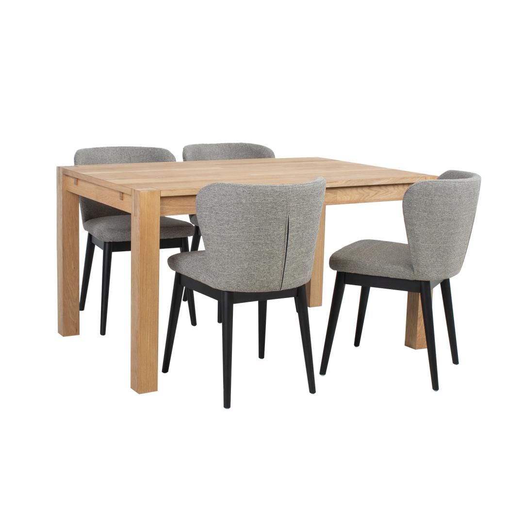Söögilauakomplekt CHICAGO NEW 4-tooliga. Laua mõõdud on 140x90xH76cm. Lauaplaat: MDF kaetud naturaalse tammespooniga. Lauajalad (8x8cm) ja raam on valmistatud täispuidust ja kaetud naturaalse tammespooniga. Laud on viimistletud puiduõliga. Tooli mõõdud on 53,5x54xH81,5cm. Tooli iste ja seljatugi on polsterdatud ja kaetud halli polüesterkangaga. Tooli jalad ja alusraam on valmistatud täispuidust ja viimistletud musta värviga. Kaalupiirang 100kg. Lauale on võimalik juurde osta pikendus 45x90cm, koodiga 84026. Pikendus on võimalik paigaldada laua mõlemasse otsa. HOOLDUS: naturaalse spooniga kaetud lauaplaat on väga tundlik niiskuskahjustuste ja temperatuuri suhtes. Kasutage alati lauanõude all alusmatte ja kuumaaluseid. Igasugune lauale sattunud vedelik tuleb koheselt kuivatada pehme lapiga. Vältige liigset hõõrumist ja abrasiivseid puhastusvahendeid. Söögilauakomplekt CHICAGO NEW 4-tooliga. Laua mõõdud on 140x90xH76cm. Lauaplaat: MDF kaetud naturaalse tammespooniga. Lauajalad (8x8cm) ja raam on valmistatud täispuidust ja kaetud naturaalse tammespooniga. Laud on viimistletud puiduõliga. Tooli mõõdud on 53,5x54xH81,5cm. Tooli iste ja seljatugi on polsterdatud ja kaetud halli polüesterkangaga. Tooli jalad ja alusraam on valmistatud täispuidust ja viimistletud musta värviga. Kaalupiirang 100kg. Lauale on võimalik juurde osta pikendus 45x90cm, koodiga 84026. Pikendus on võimalik paigaldada laua mõlemasse otsa. HOOLDUS: naturaalse spooniga kaetud lauaplaat on väga tundlik niiskuskahjustuste ja temperatuuri suhtes. Kasutage alati lauanõude all alusmatte ja kuumaaluseid. Igasugune lauale sattunud vedelik tuleb koheselt kuivatada pehme lapiga. Vältige liigset hõõrumist ja abrasiivseid puhastusvahendeid.