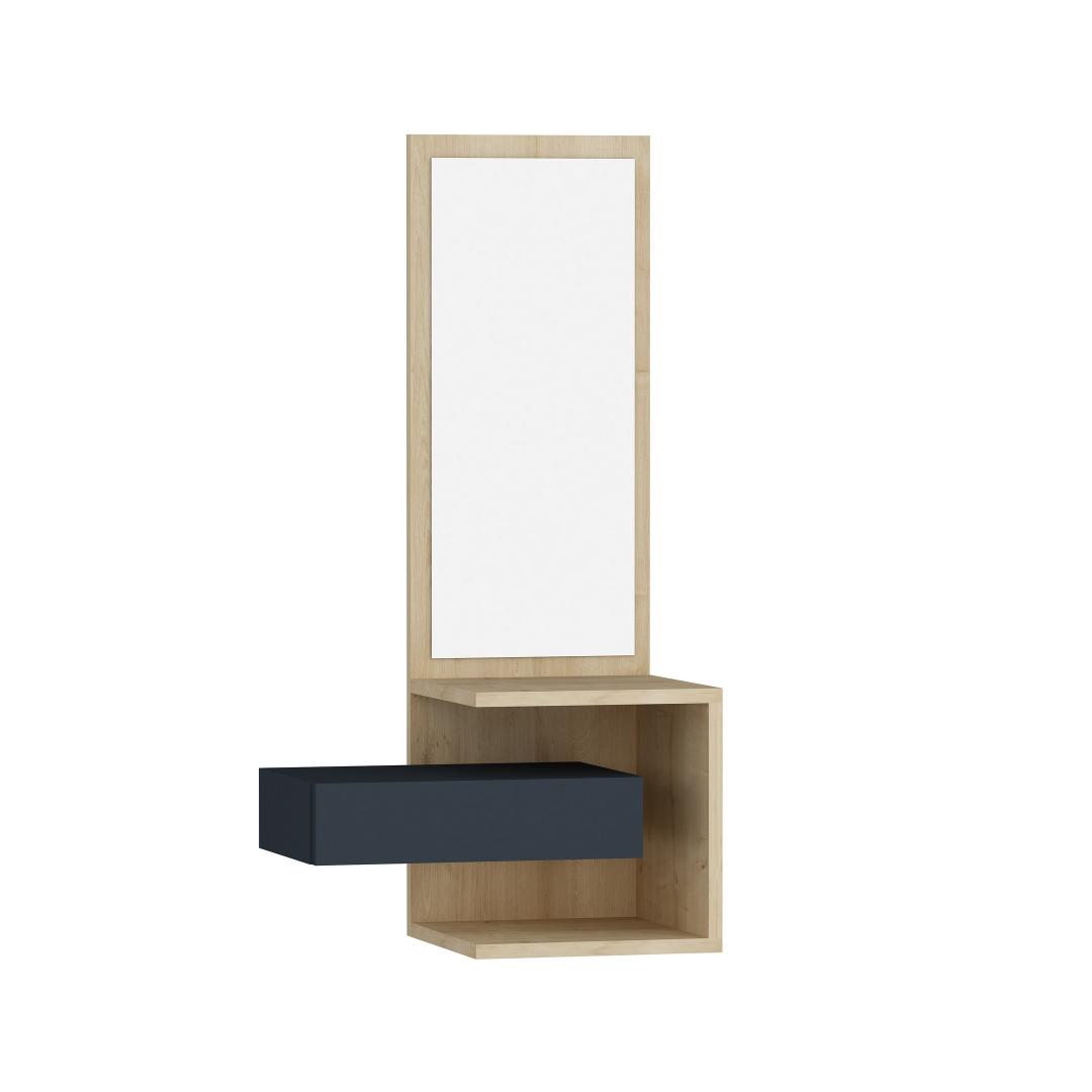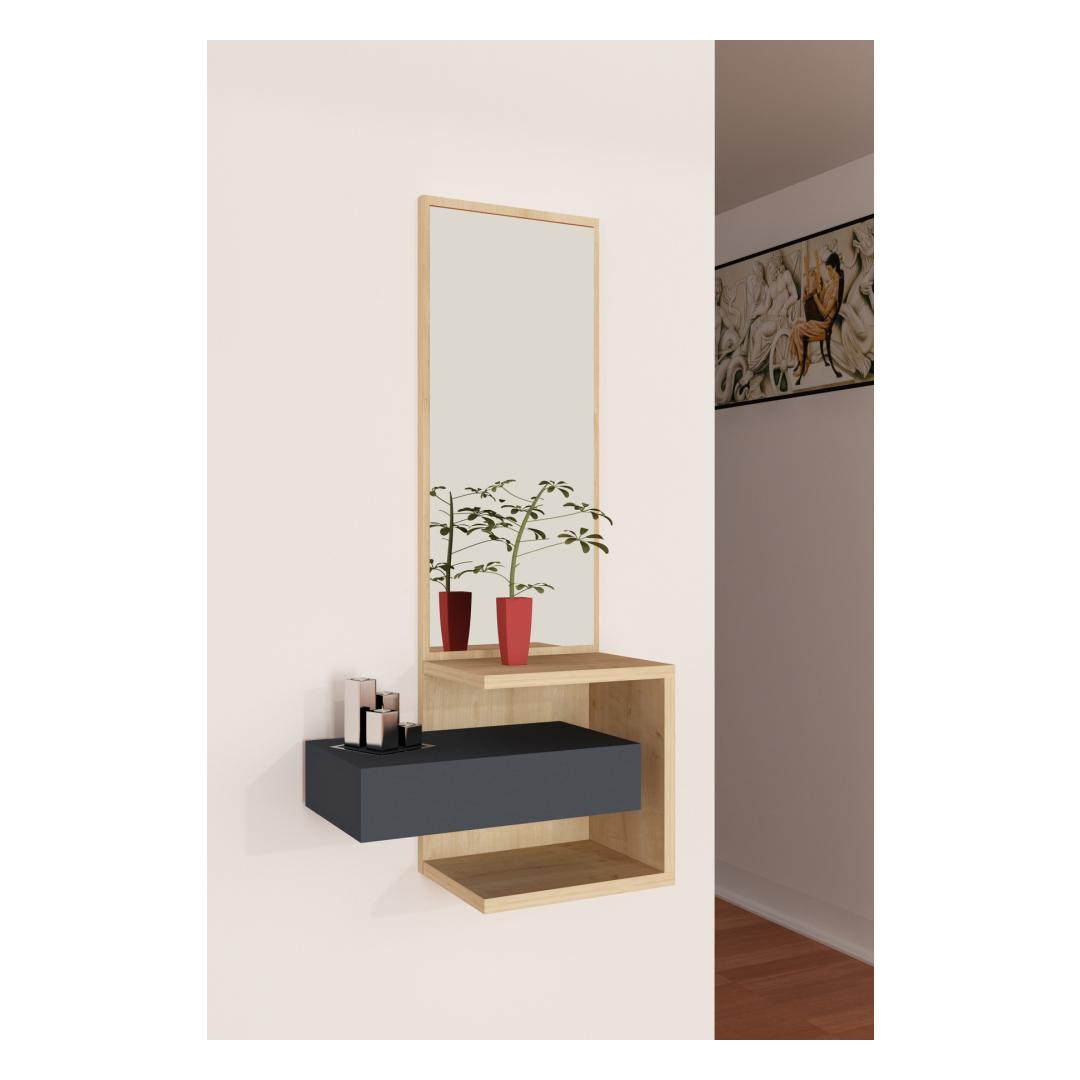 Tänu arvukatele riiulitele ja avarale sahtlile pakub see esiku statiiv rohkelt hoiuruumi igapäevaste esmatarbekaupade jaoks. Hoidke oma võtmed, päikeseprillid ja muud väiksemad esemed organiseeritult ja hõlpsasti kättesaadavana. Kaasasolev peegel lisab mugavust, mis võimaldab teil enne uksest väljumist kiiresti oma välimust kontrollida.