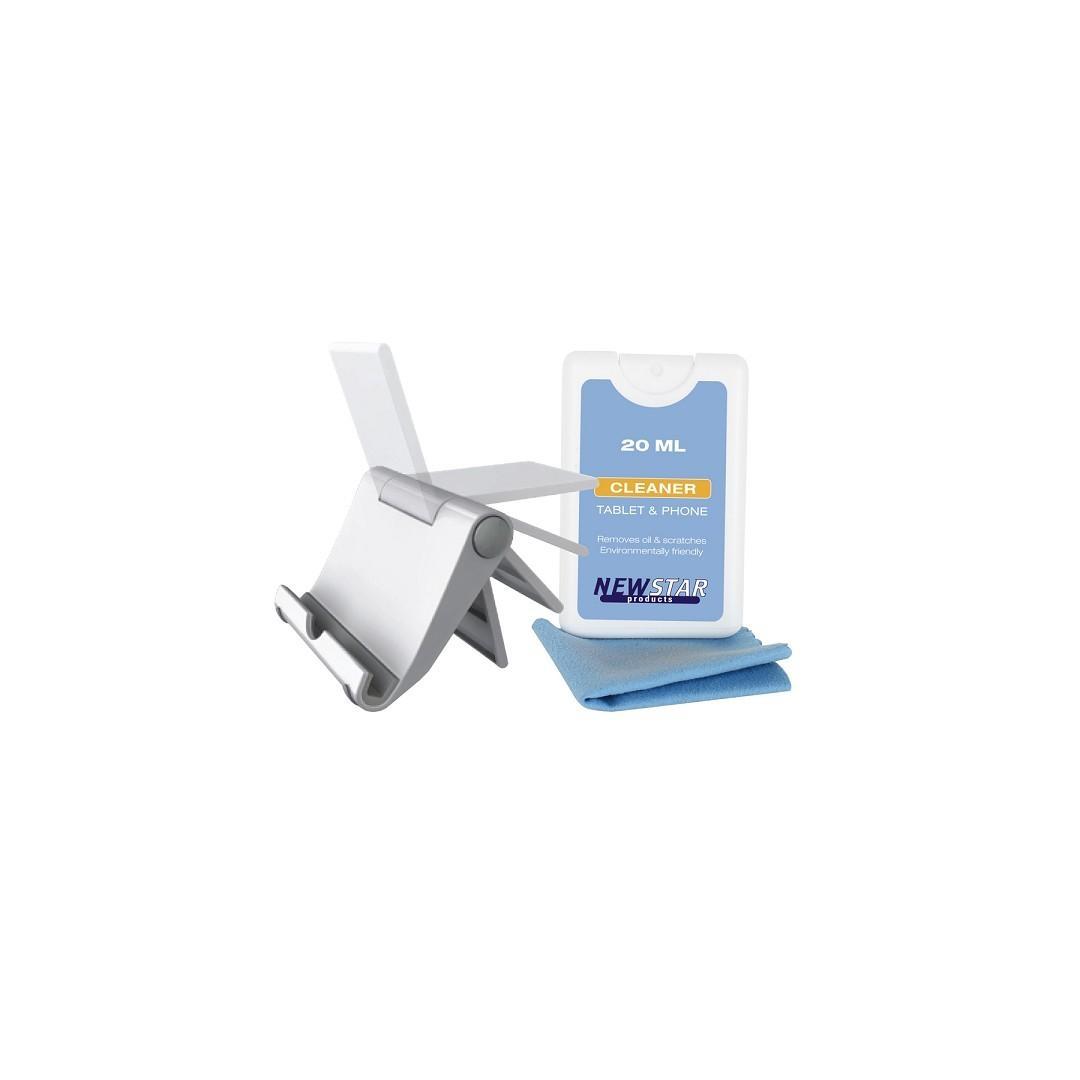 Weight 0.12 kg The universal NewStar tablet/smartphone stand and cleaner kit, model NS-MKIT100 is a tiltable universal desk stand for tablets and smartphones including cleaning kit. This stand is a great choice when you want the ultimate viewing flexibility with your tablet or smartphone when placement on desks. Remove dirt, dust, fingerprints and other debris with the cleaning kit included. Keep it in brand new shape and looks.