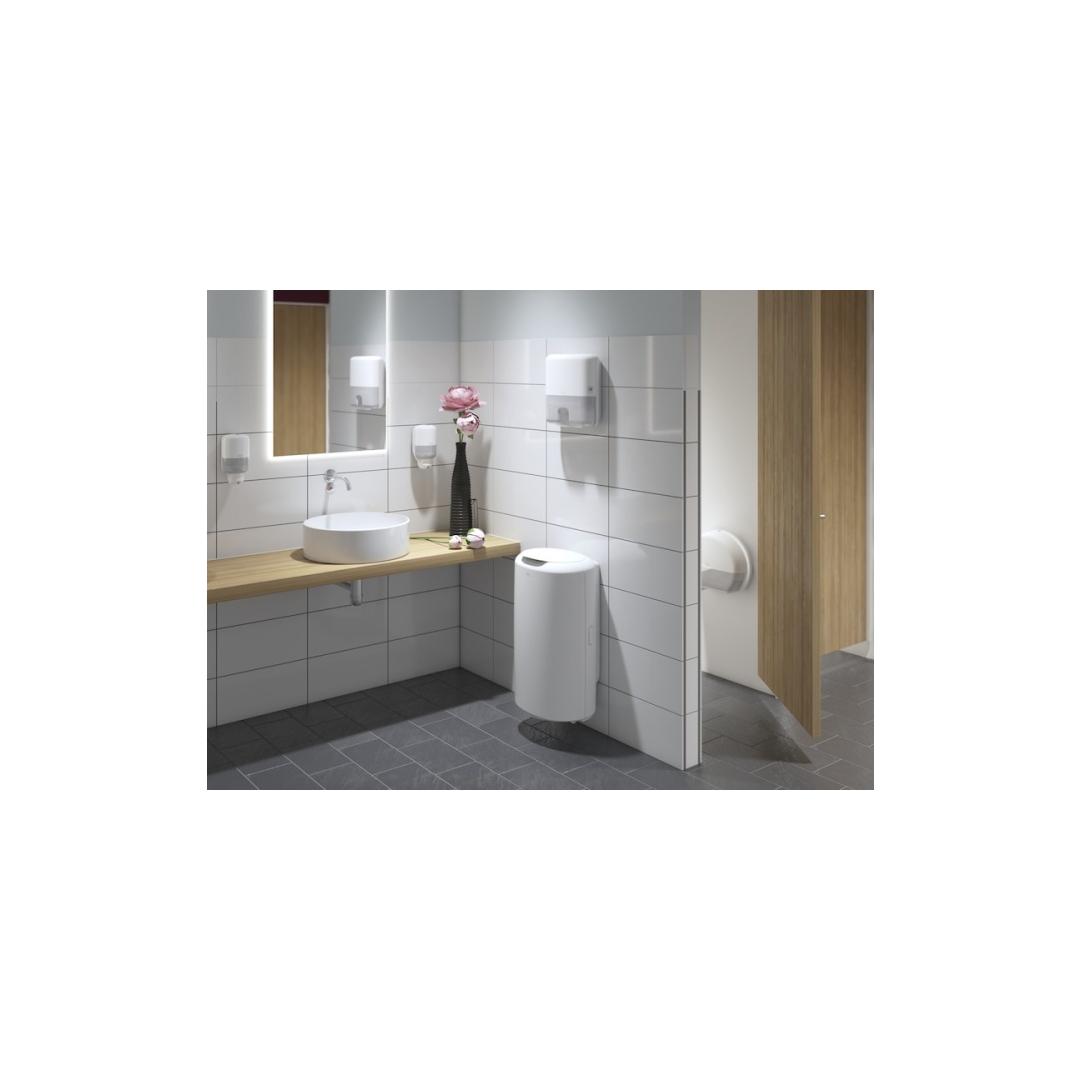 The Tork Mini Jumbo Toilet Roll Dispenser in Elevation Design is ideal for medium to high-traffic washrooms where time efficiency and reduced cost are important. The high capacity saves maintenance time and ensures that paper is always available. The Tork Elevation dispensers have a seamless, functional, modern design, that makes a lasting impression on your guests.