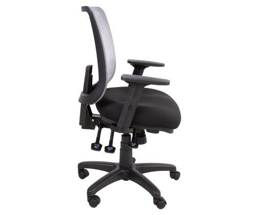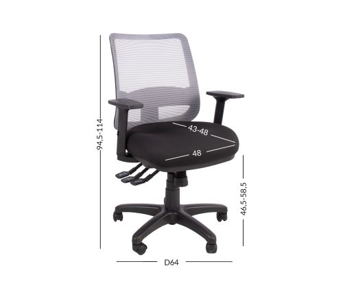 Töötool SAGA must/hall. SAGA on vastupidav ja ergonoomiline töötool, mis tagab mugava tööasendi terveks päevaks. Tooli on võimalik reguleerida vastavalt iga kasutaja eelistustele. Iste on kaetud polüesterkangaga, 50 000 Martindale’i. Seljatugi on kaetud polüestervõrkkangaga, mis tagab hea õhu liikuvuse. Reguleeritav nimmetugi. Multifunktsionaalne mehhanism võimaldab reguleerida istet ja seljatuge sõltumatult. Seljatoe kõrgus on reguleeritav vahemikus 48-55,5cm. Seljatoe kaldenurk on reguleeritav ja fikseeritav. Istme sügavus ja kaldenurk reguleeritavad, negatiivne kalle. Istme kõrgus on reguleeritav gaasamordi abil. Käetoed on mustast plastikust. Käetugede sügavus ja pöördenurk on reguleeritavad, kõrgus on reguleeritav 17,5-27,5cm. 5-haruline must jalarist on polüpropüleenplastist, D64cm. Toolil on plastikrattad, 50mm. Tooli kõrgus on 94,5-114cm, istme kõrgus 46,5-58,5cm, istme sügavus 43-48cm, istme laius 48cm. Toote mõõdud on 65,5x64xH94,5-114cm. Tooli kaalupiirang on 120kg.
