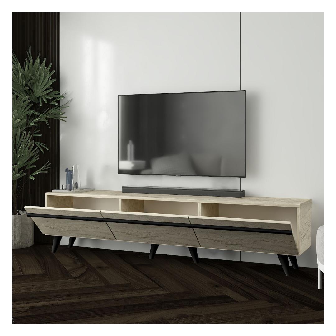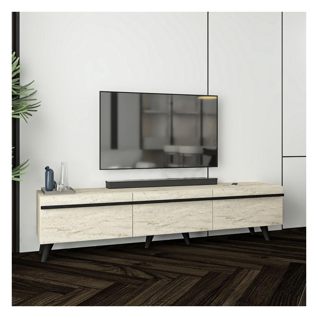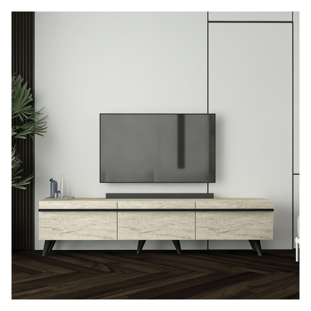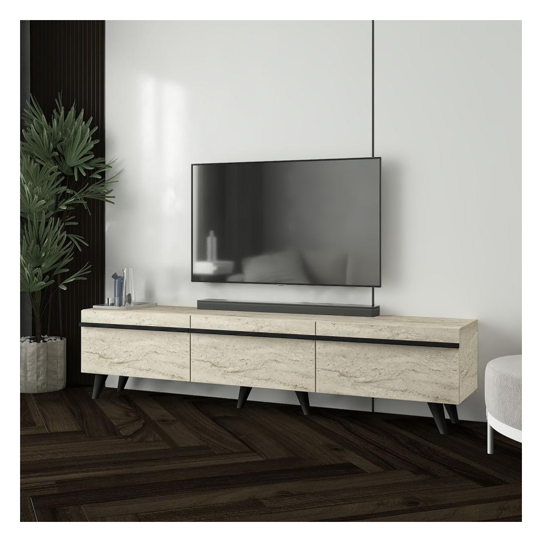 Elegantne disain: Travertiini ja musta värvi kombinatsioon annab sellele telerialusele rafineeritud ja kaasaegse ilme, mis sobib igasuguse sisustuse stiiliga.