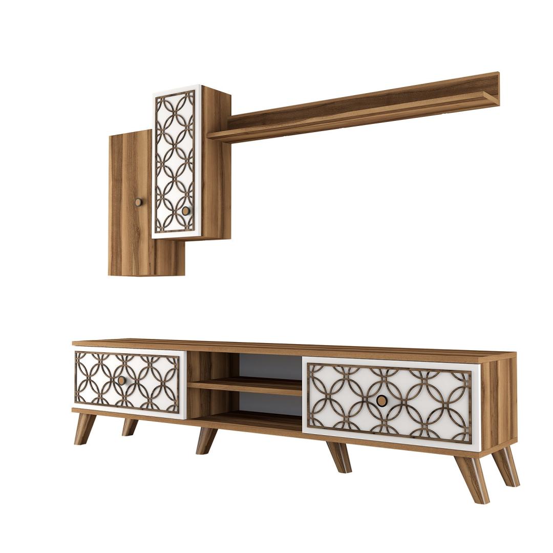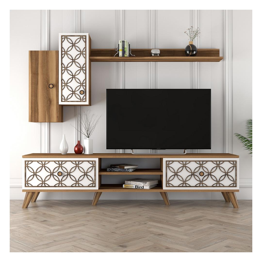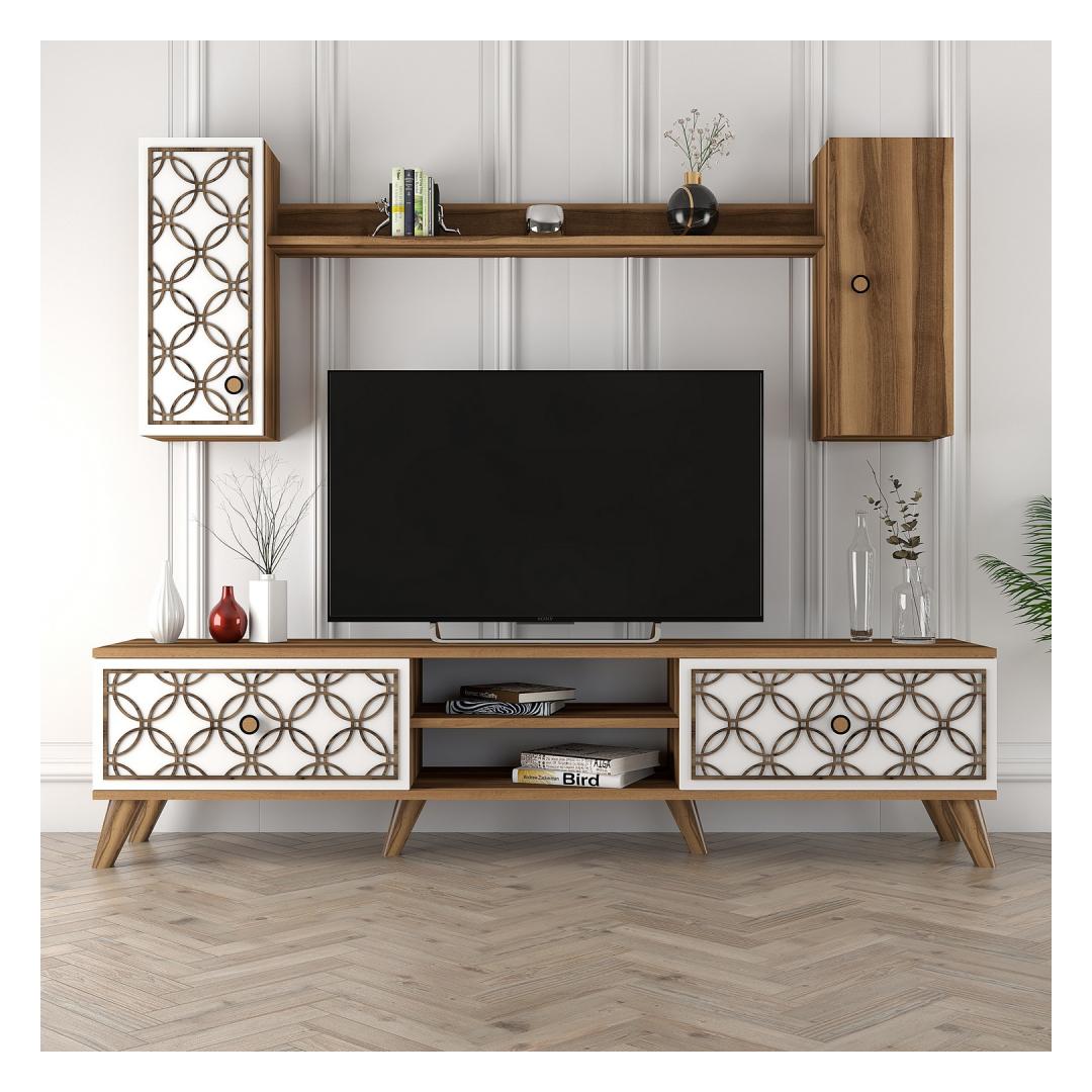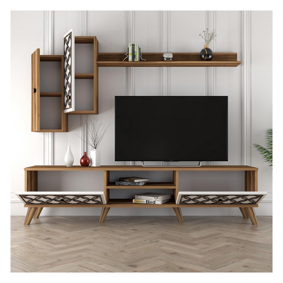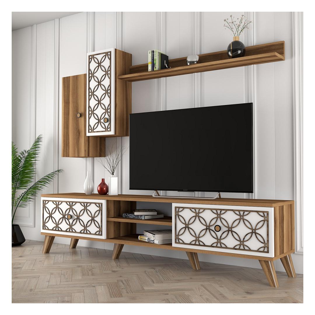 Pähklipuu ja valge värvikombinatsioon lisab teie elutuppa kaasaegset hõngu, samas kui arvukad riiulid võimaldavad teil eksponeerida oma lemmik sisustuselemente. Telerikappi saab ka seina külge kinnitada, et tagada lisaturvalisus, andes teile meelerahu.
