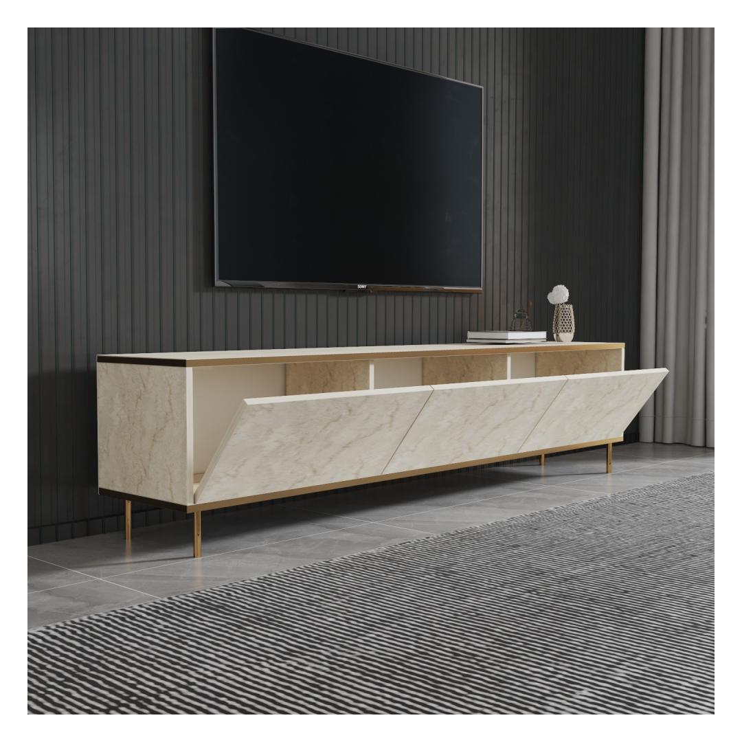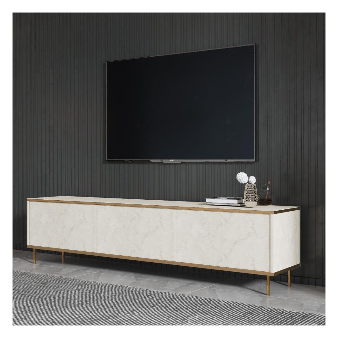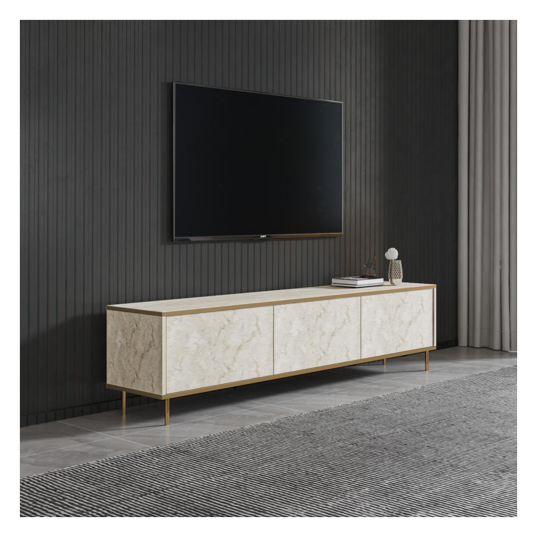 Muuda oma elutuba luksuslikuks pühapaigaks meie uimastava travertiini ja kulla värvi teleripuldiga. Elegantne marmorkontseptsioon lisab igasse ruumi elegantsust, samal ajal kui elegantse disainiga statiiv pakub piisavalt ruumi kõigile teie meelelahutusvahenditele.